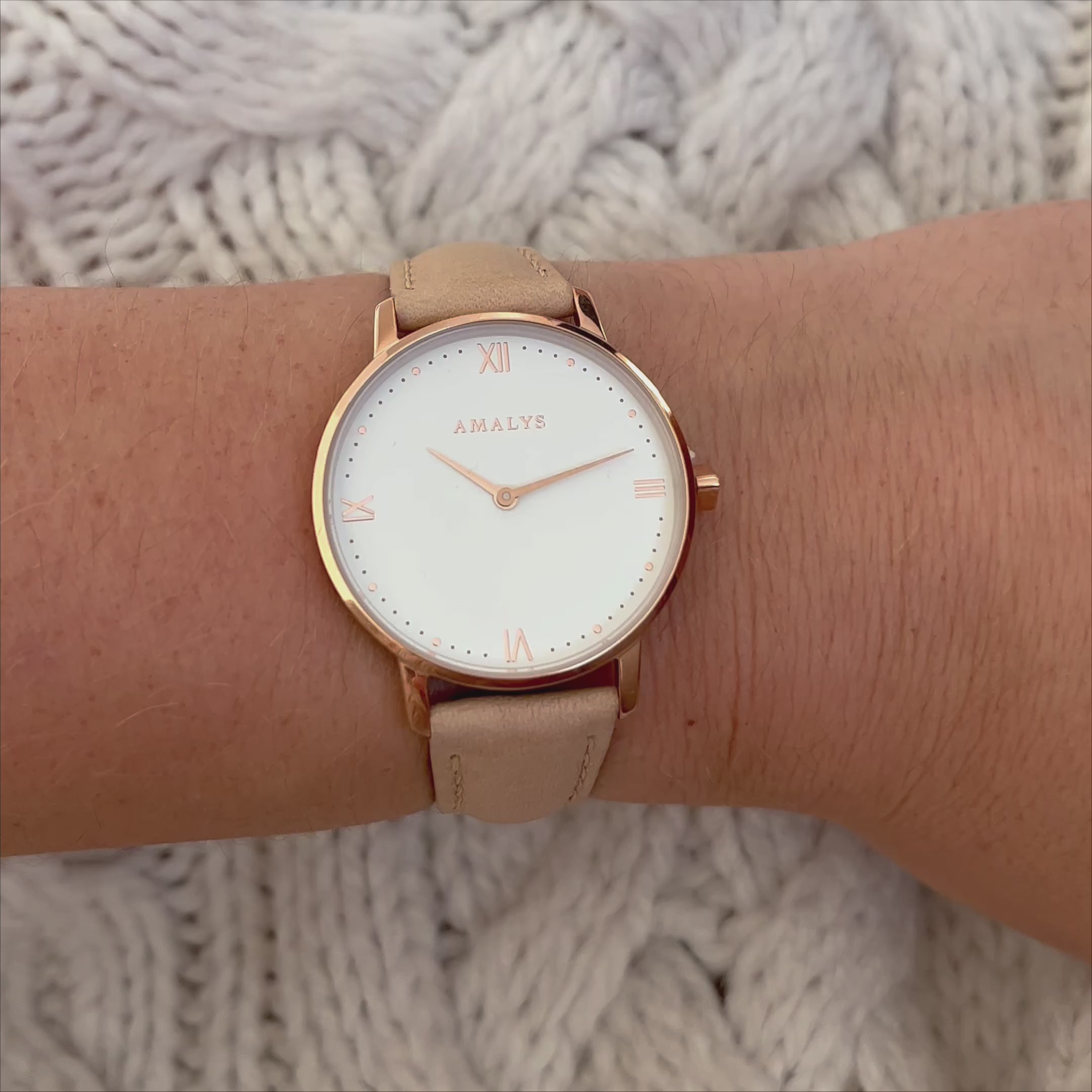 Vous ne pouvez pas vous tromper avec Juliette. Son cadran blanc dans un boîtier en or rose et son bracelet nude apporteront sobriété et élégance à toutes vos tenues.