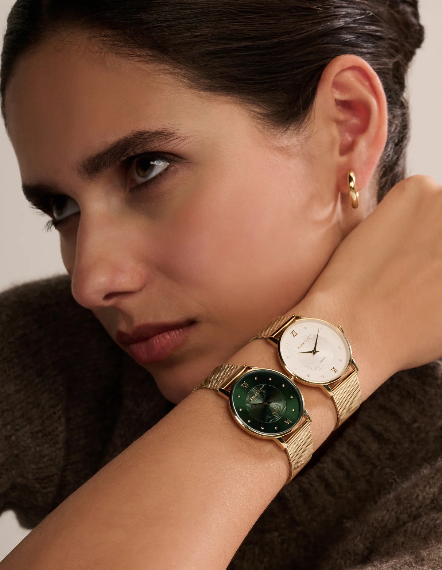 La collection Simone réunit des montres pour femme au boîtier rond, aux cadrans délicatement travaillés et aux finitions précieuses. Déclinées en bracelets en acier aux tons or ou argent, elles se distinguent par leurs détails raffinés et leur allure sophistiquée. Pensées comme de véritables pièces horlogères, les montres Simone allient technicité, élégance et féminité, pour sublimer le poignet avec justesse et caractère, fidèles à l’exigence Amalys.