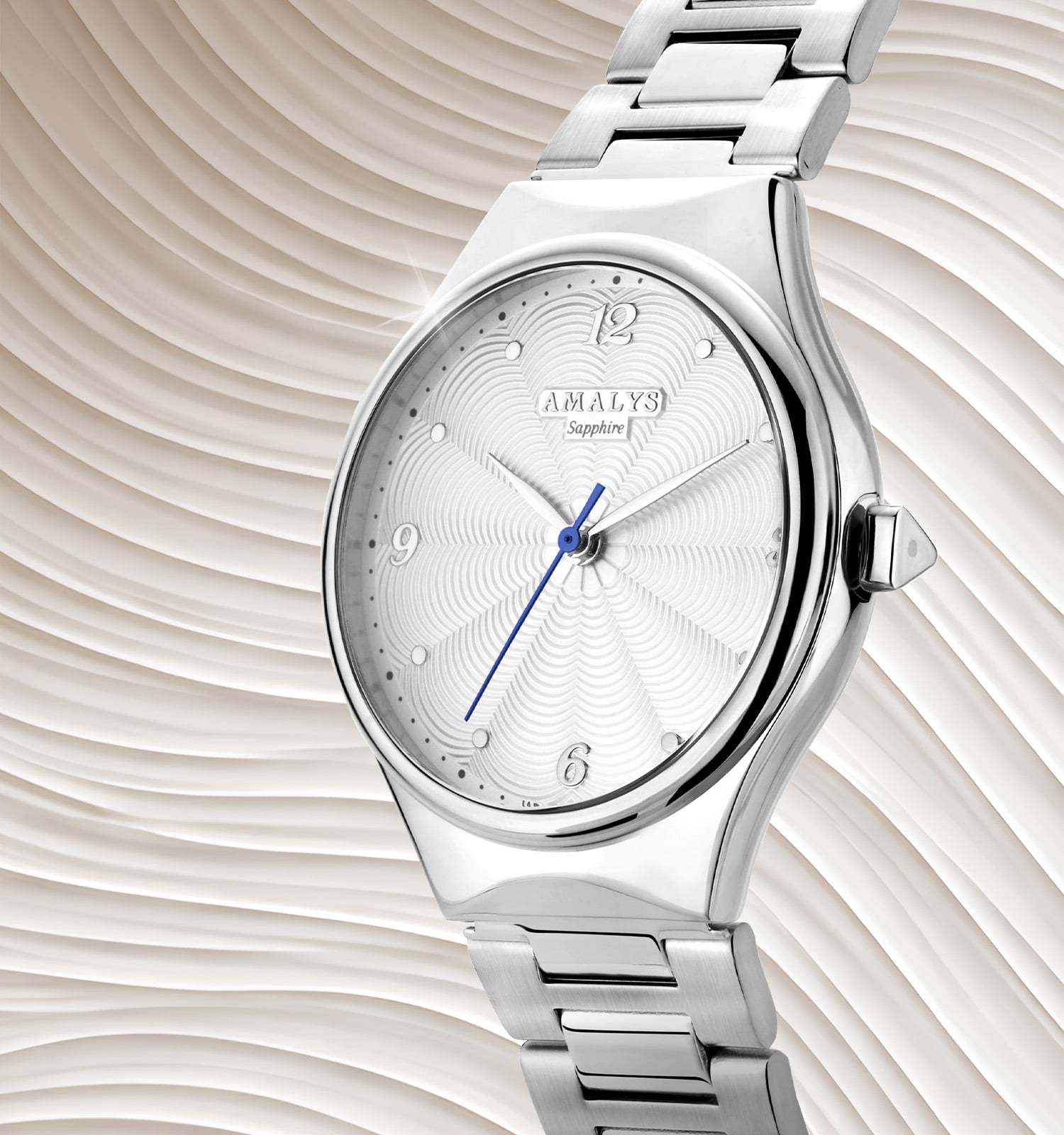 Avec son cadran finement guilloché aux reflets argentés, cette montre joue avec la lumière dans une élégance toute en nuances. Les index et aiguilles argentés s’intègrent parfaitement au boîtier et au bracelet en acier, relevées par une subtile aiguille bleutée pour les secondes.
