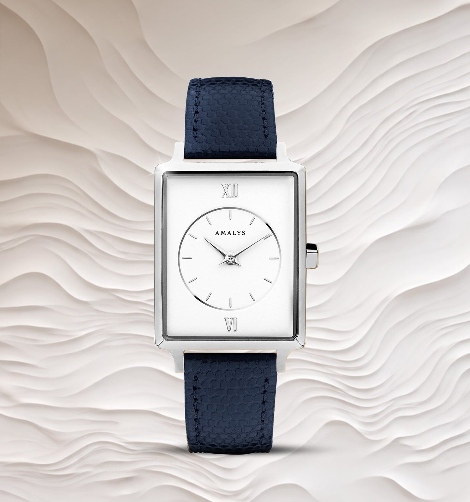 Avec son cadran blanc épuré et son boîtier rectangulaire en acier argenté, ce modèle mise sur une élégance sobre et contemporaine. Le bracelet en cuir bleu texturé apporte une touche de caractère discrète, pour une allure équilibrée et raffinée.