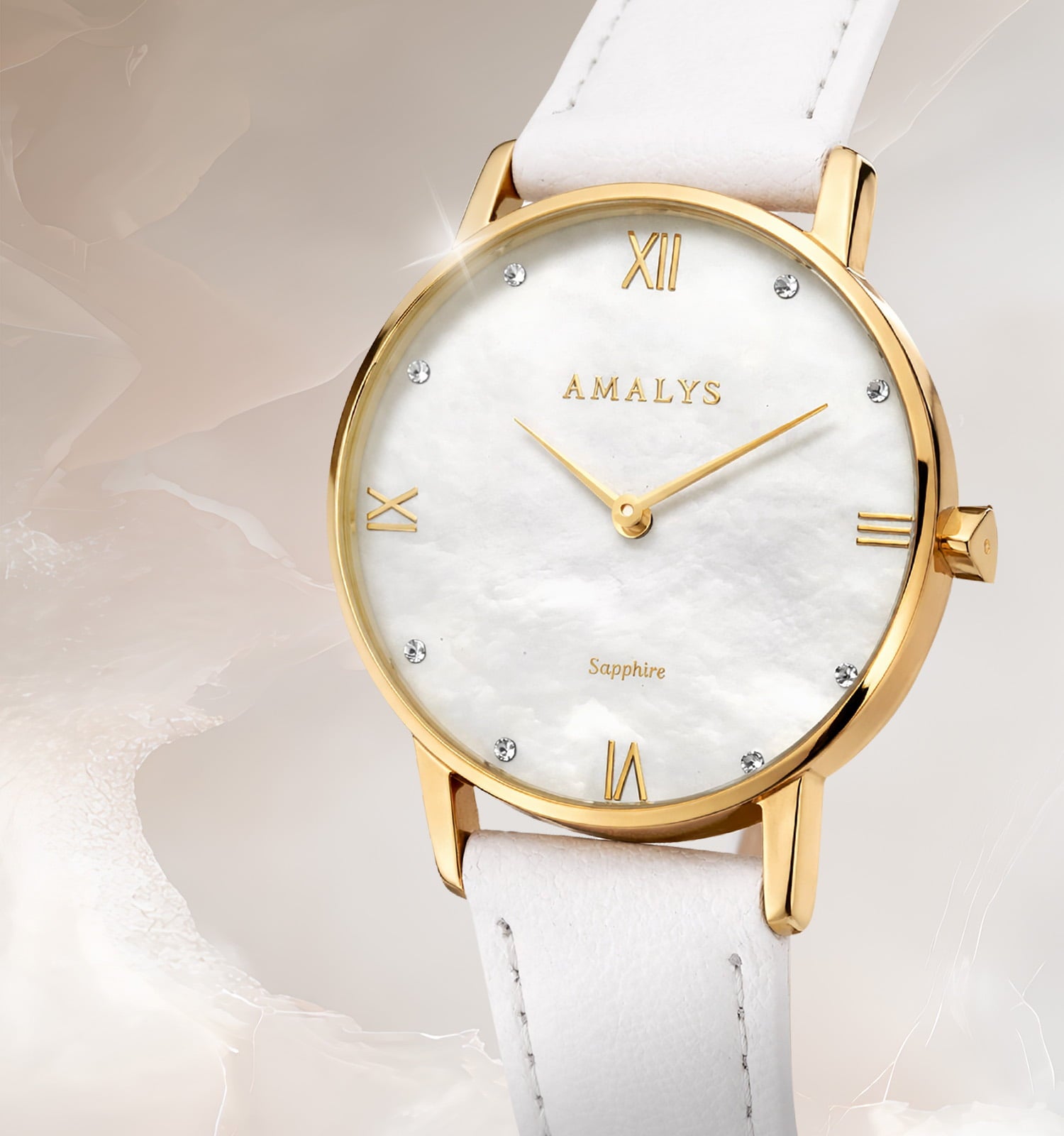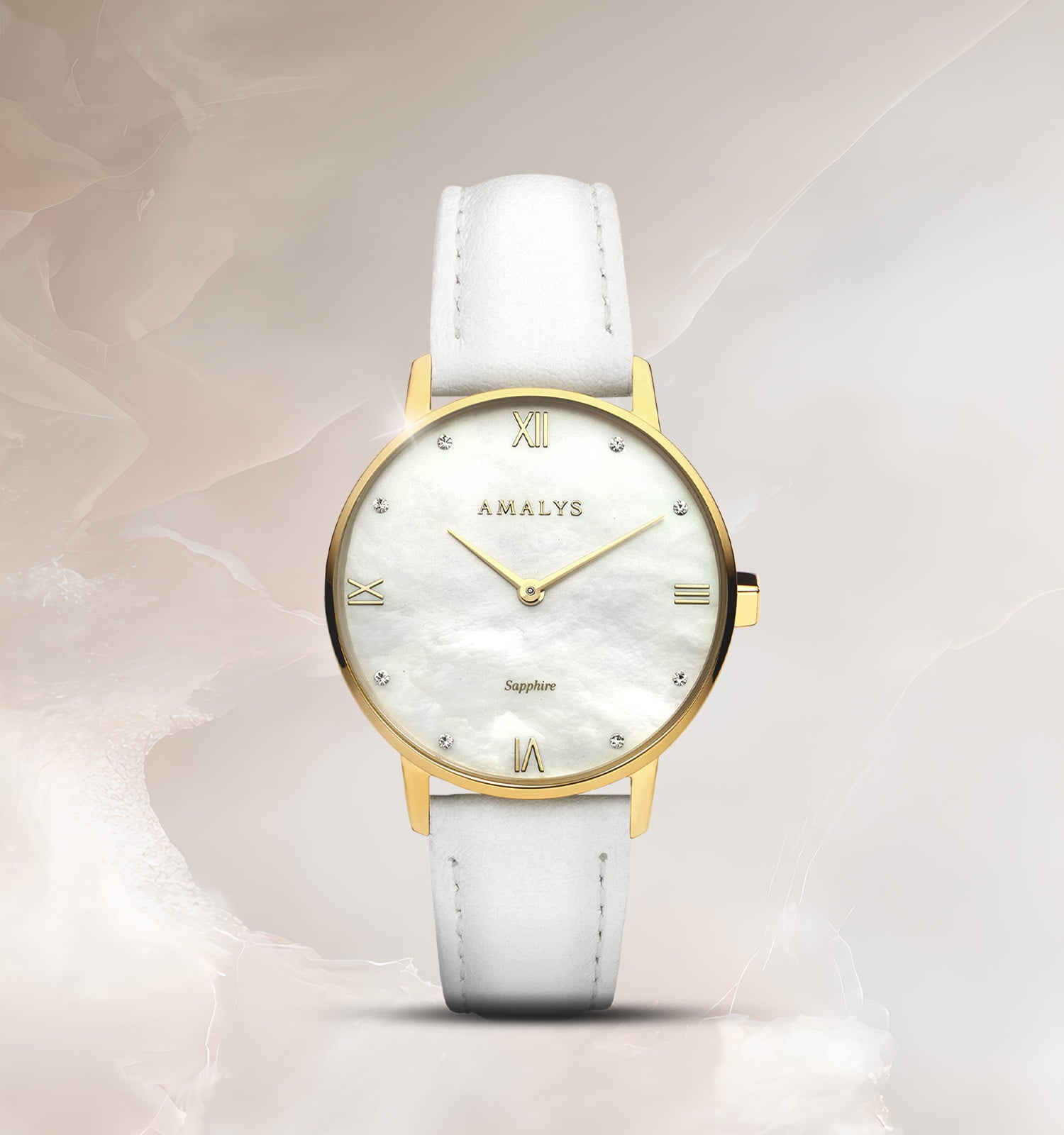 Het horloge Amalys Albane: de puurheid van een rond gouden horloge met lichtgevend parelmoer