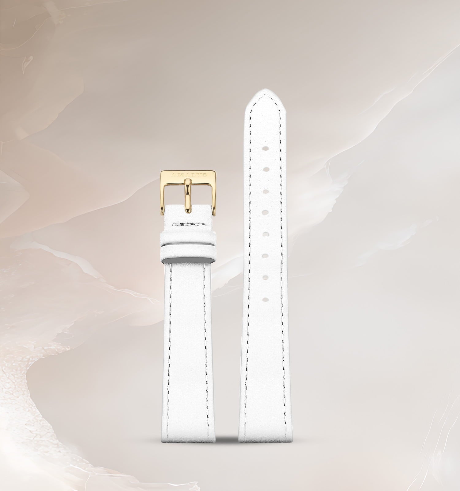 Het Albane-horloge valt op door het zachte, lichte parelmoer en de uitgebalanceerde details. In combinatie met een gouden kast en een witte leren band straalt het een heldere, pure en verfijnde elegantie uit.
