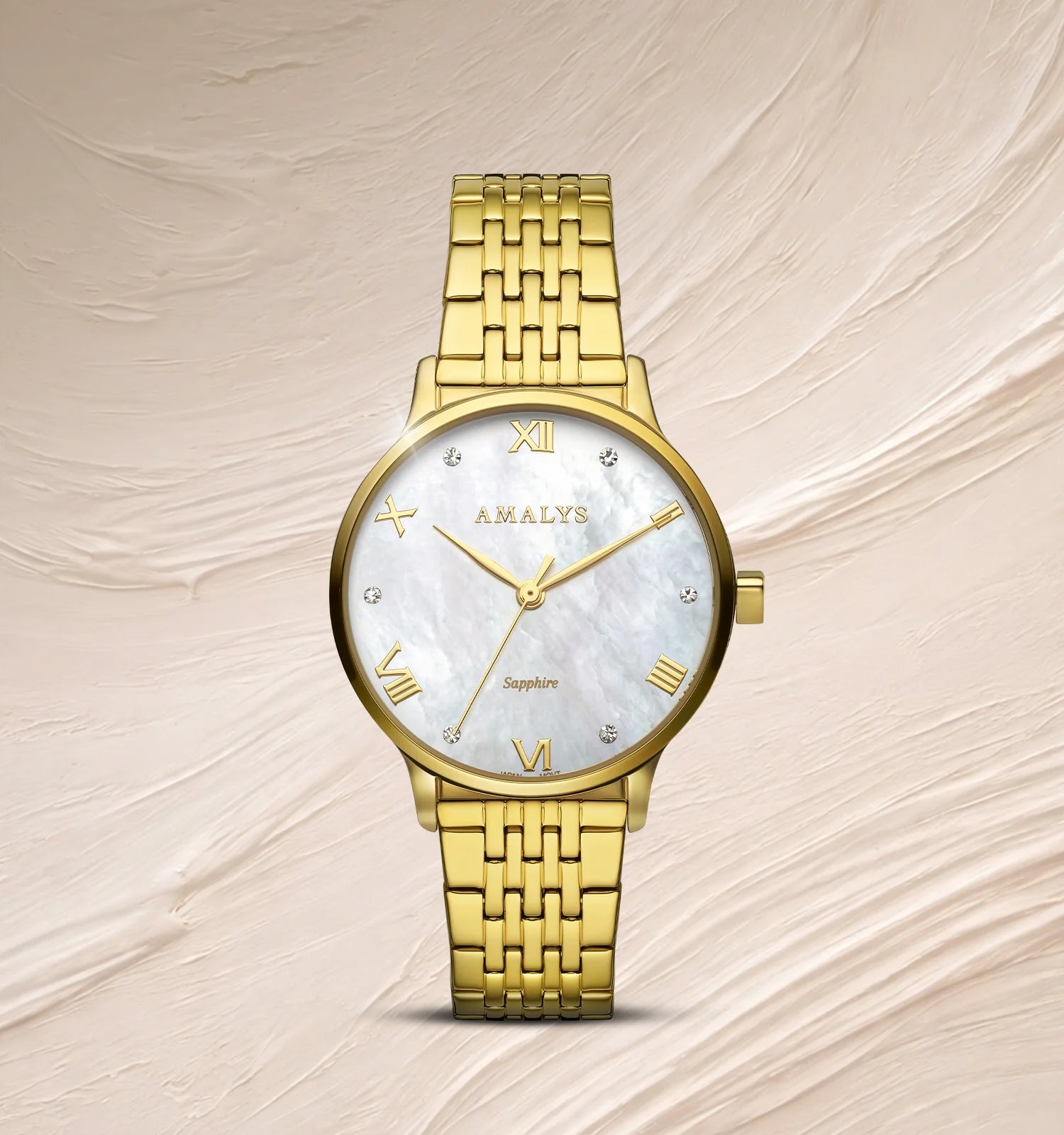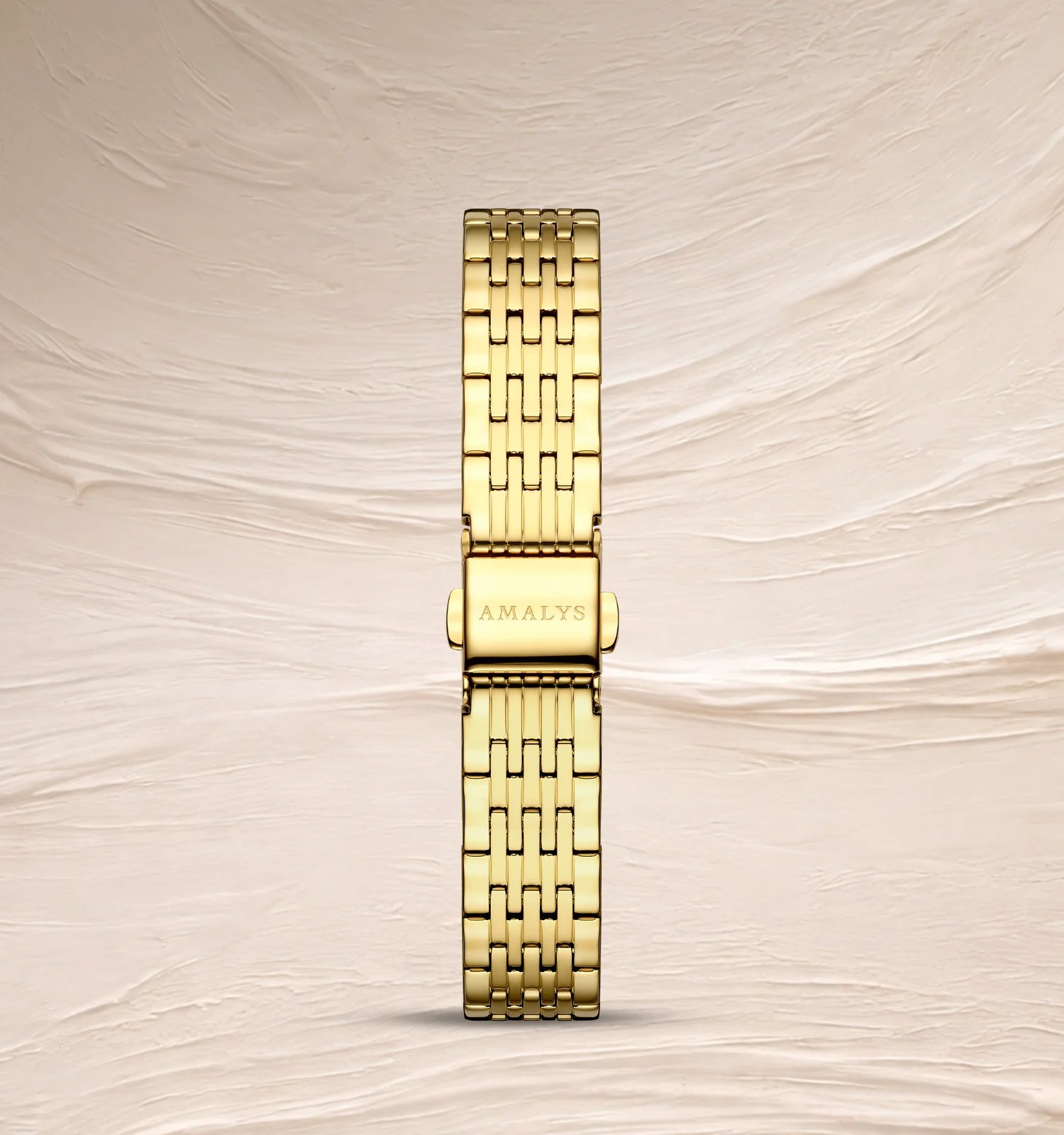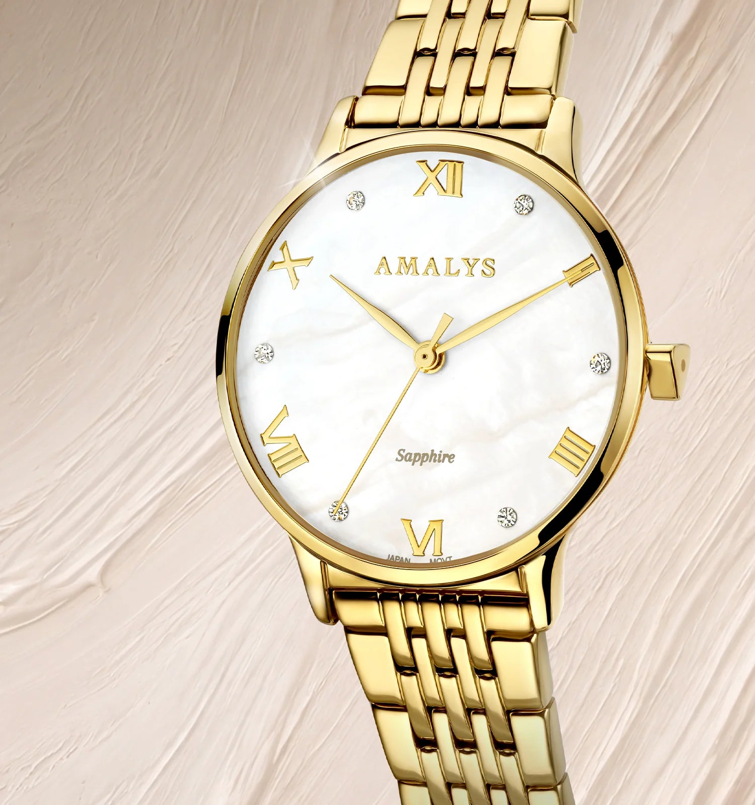 Audrey valt op door zijn witte parelmoeren wijzerplaat, waarvan de subtiele reflecties het licht op een verfijnde manier vangen. De vergulde stalen band versterkt de elegante uitstraling, voor een stralend en tijdloos horloge.
