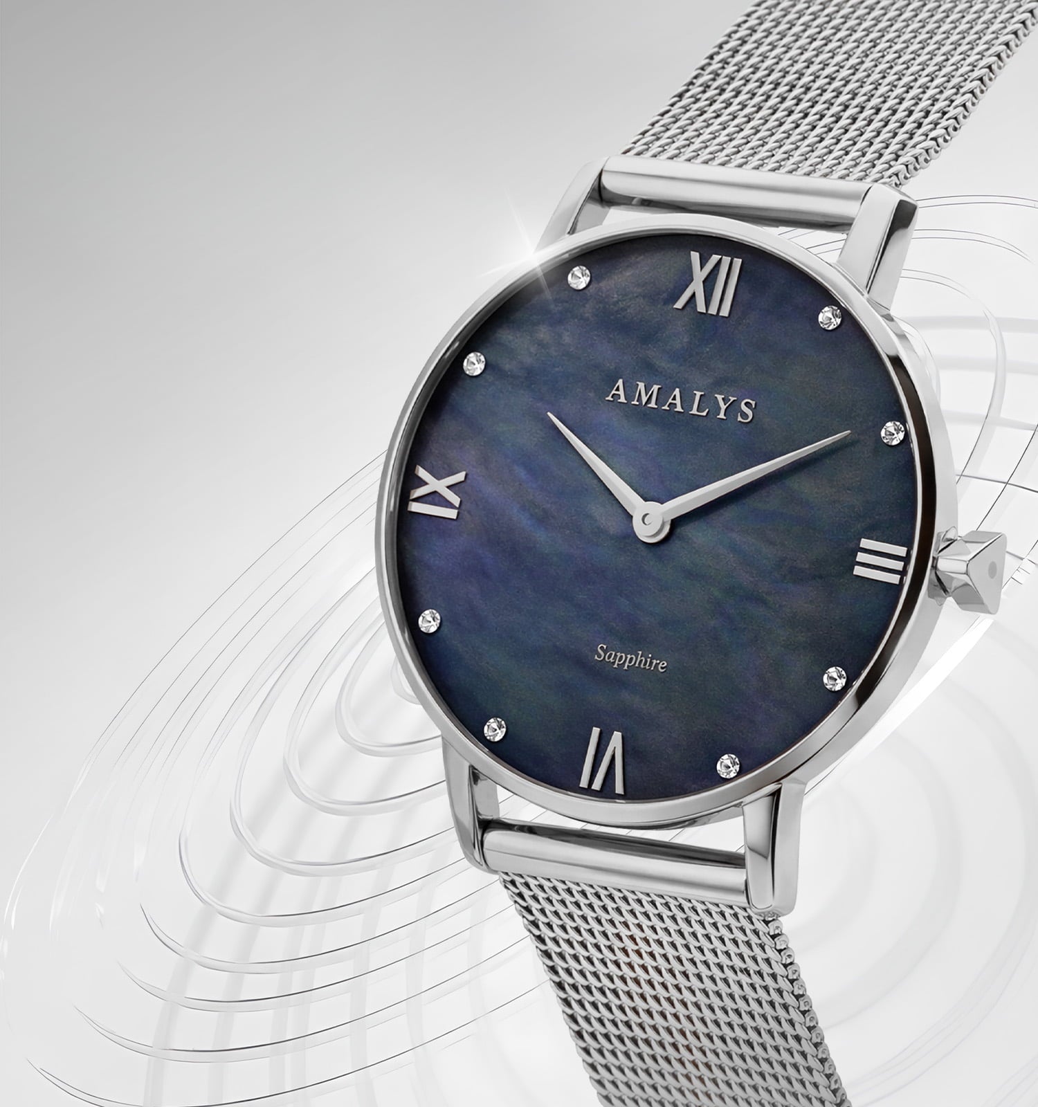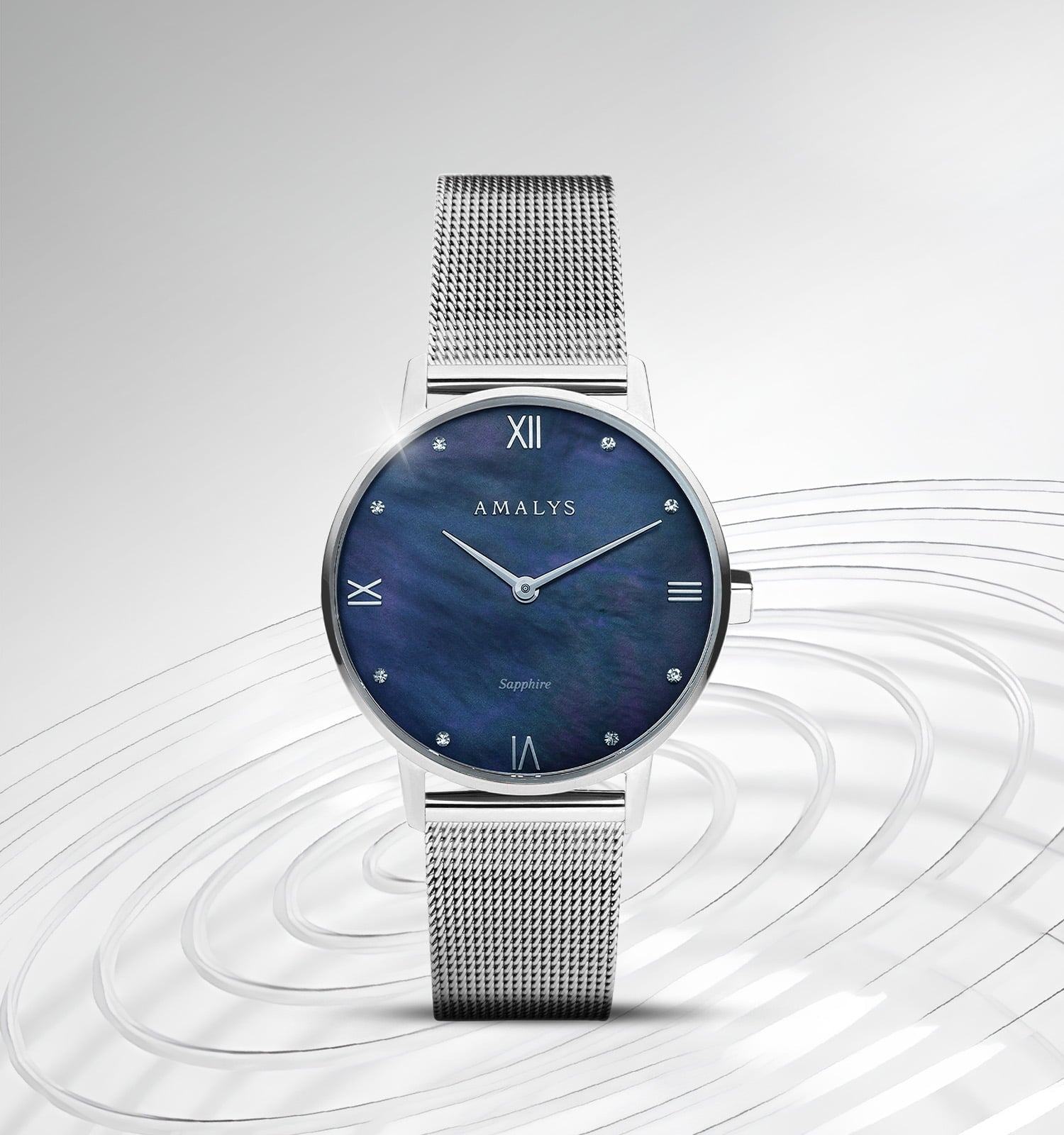 Het Aurore-horloge heeft een blauwachtige parelmoeren wijzerplaat met diepe, veranderende nuances. Het Silver staal Silver het Milanese gaas benadrukken de frisse, eigentijdse esthetiek, ontworpen voor subtiele, moderne elegantie.