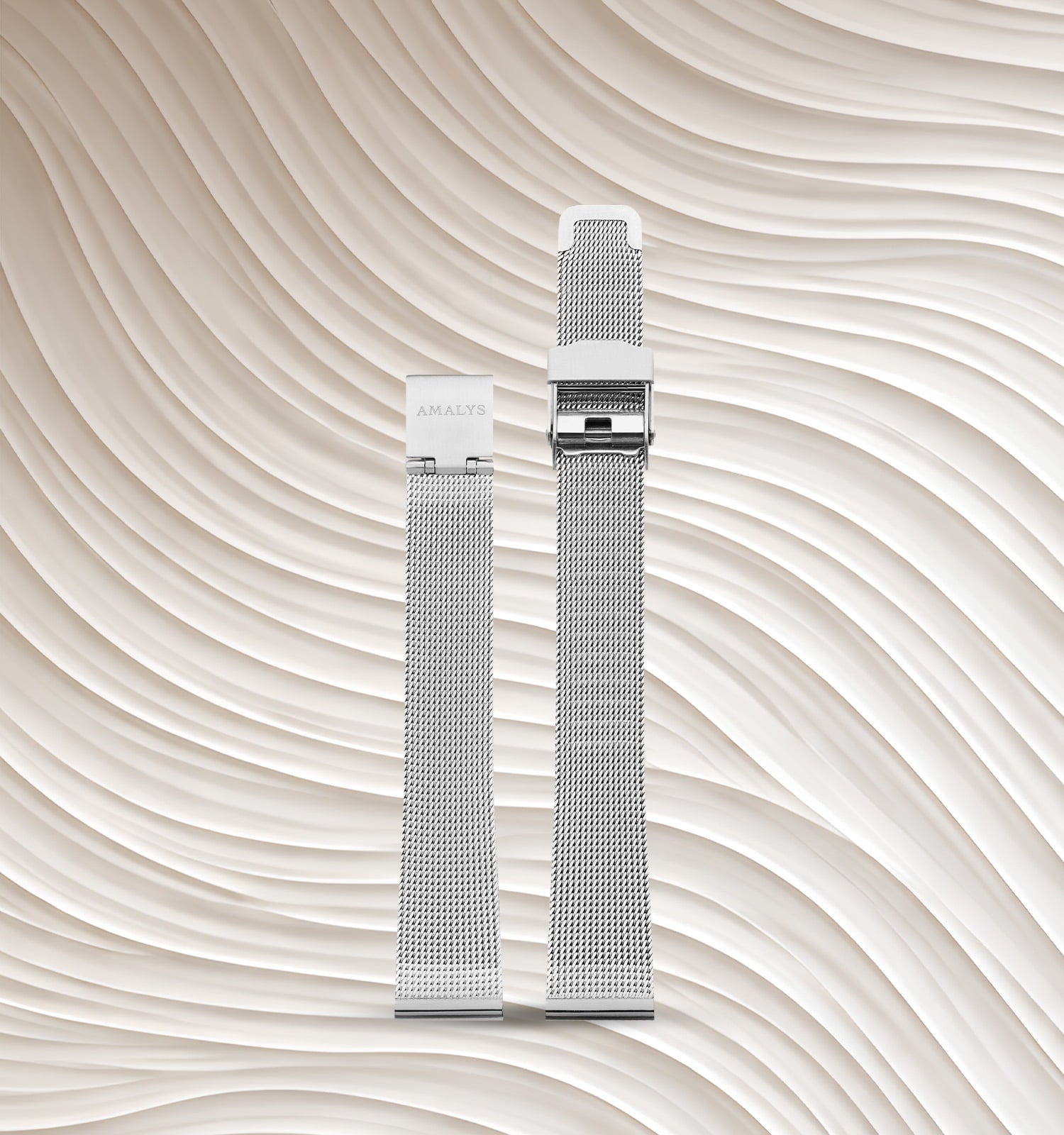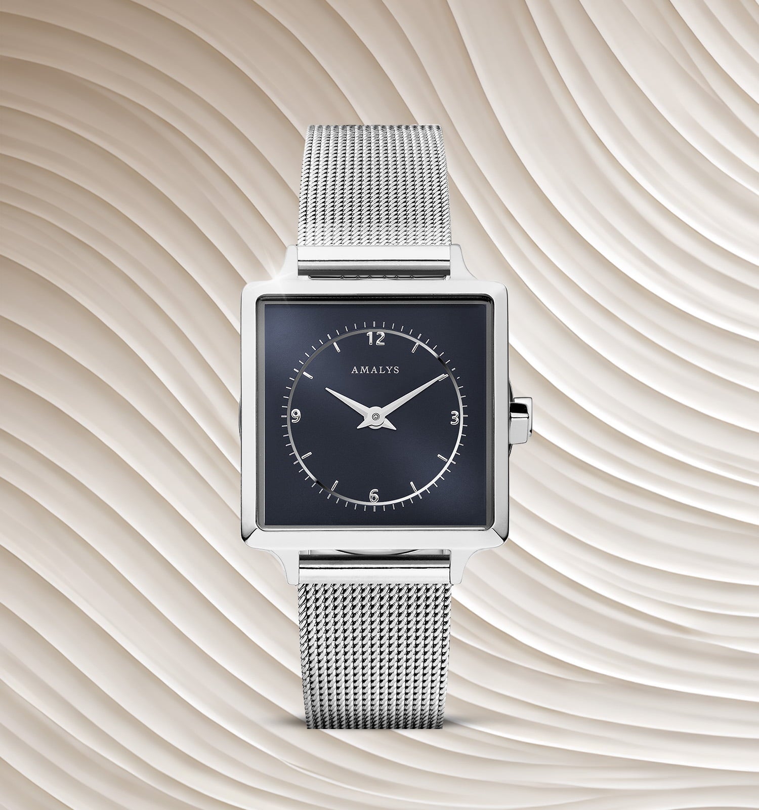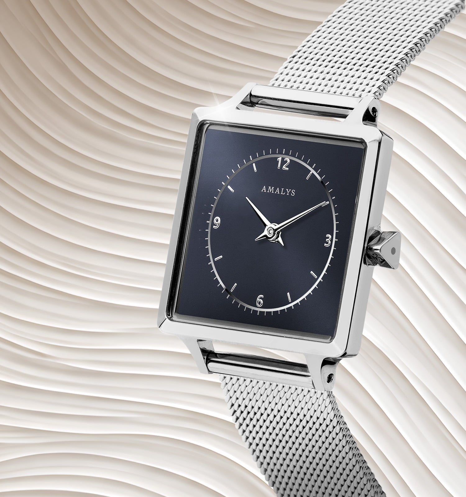 Chloé valt op door de schittering van zijn blauwe zonnestraalwijzerplaat, subtiel geaccentueerd door een vierkante kast van Silver staal. Het Milanese gaas geeft een gevoel van lichtheid en beweging en zorgt voor een delicate en harmonieuze uitstraling.