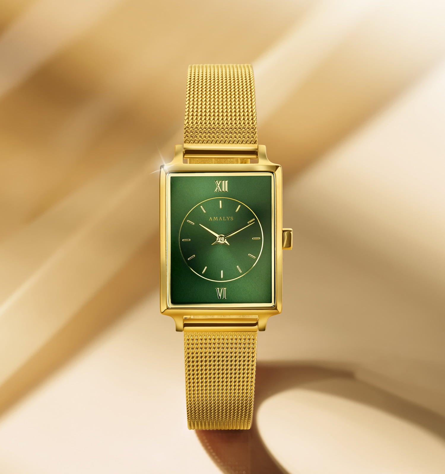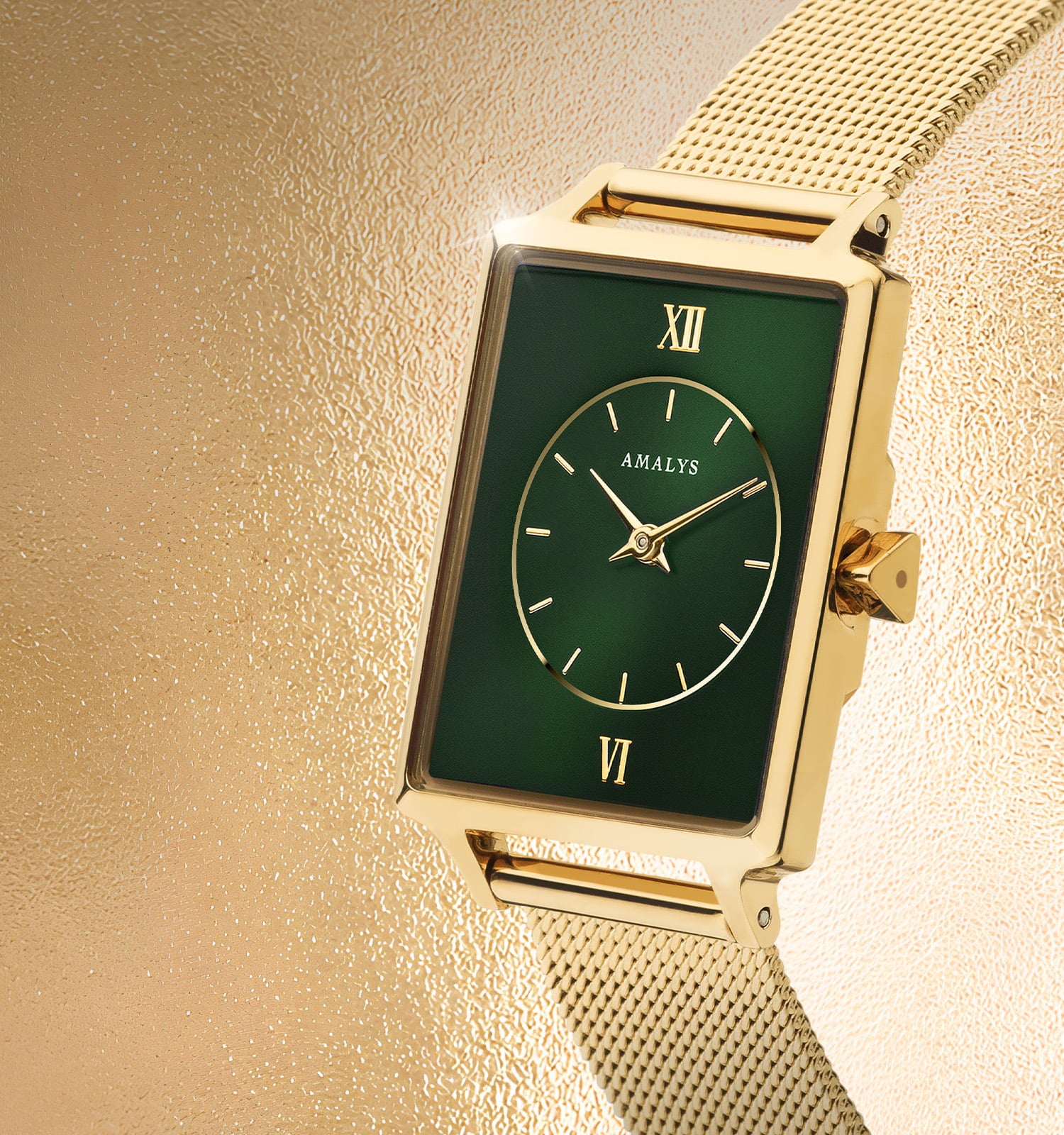 Met zijn intens groene wijzerplaat en rechthoekige gouden kast heeft Colette een unieke uitstraling. Het Milanese gaas zorgt voor een delicate elegantie en een perfect evenwicht.