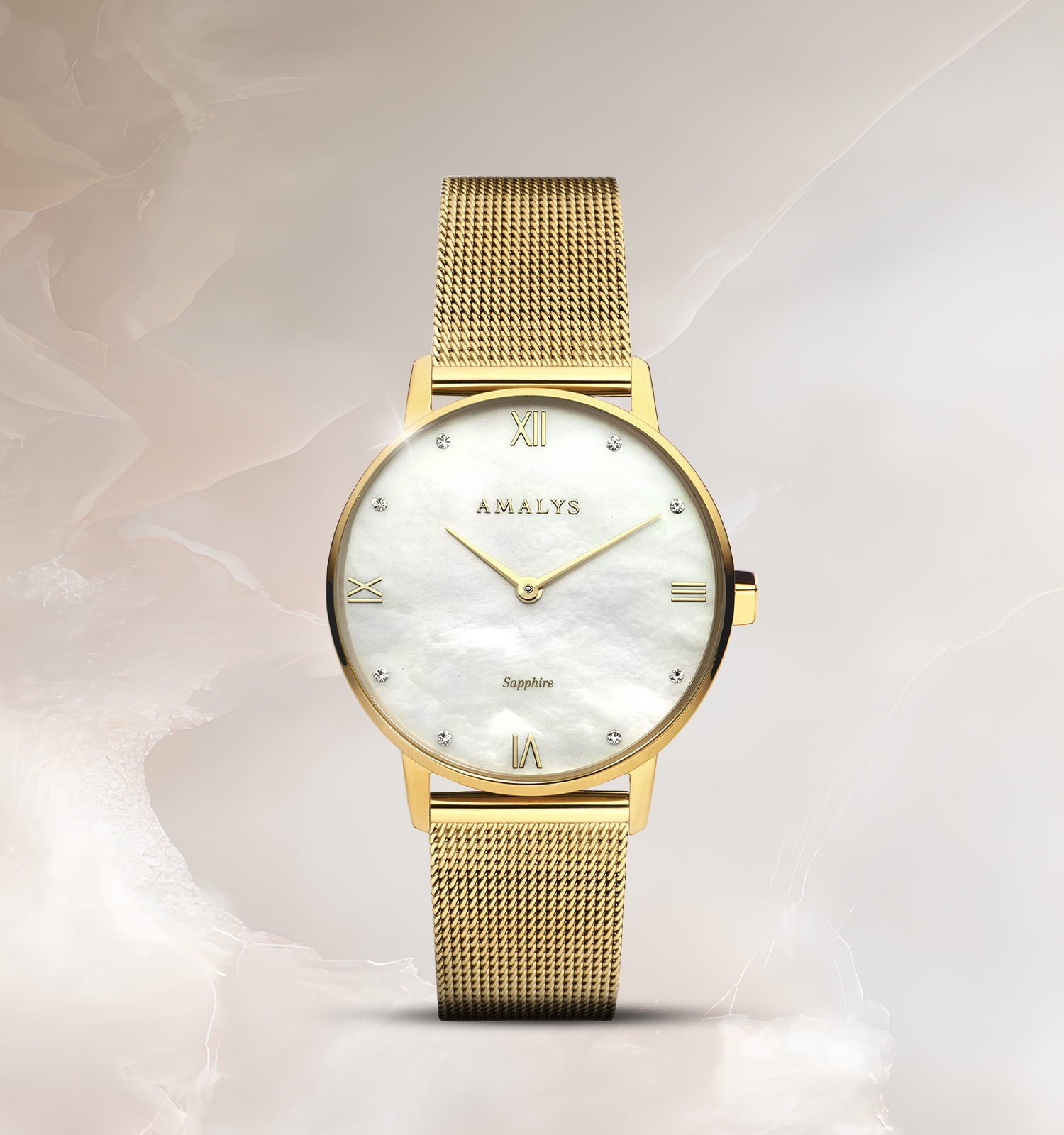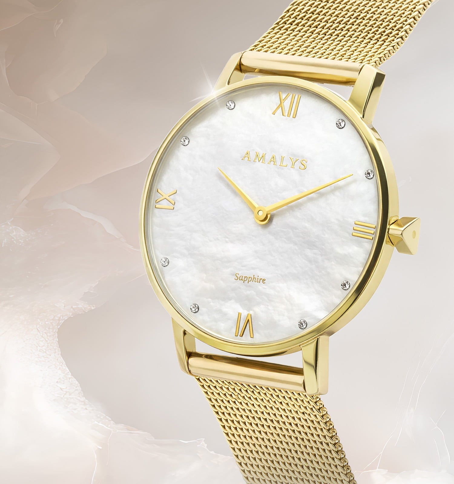 Diana heeft een wijzerplaat van parelmoer met natuurlijke glans, versierd met subtiele briljanten en delicate Romeinse cijfers. Het gepolijste goud en de gouden Milanese schakelband zorgen voor een kostbare, elegante en tijdloze uitstraling.