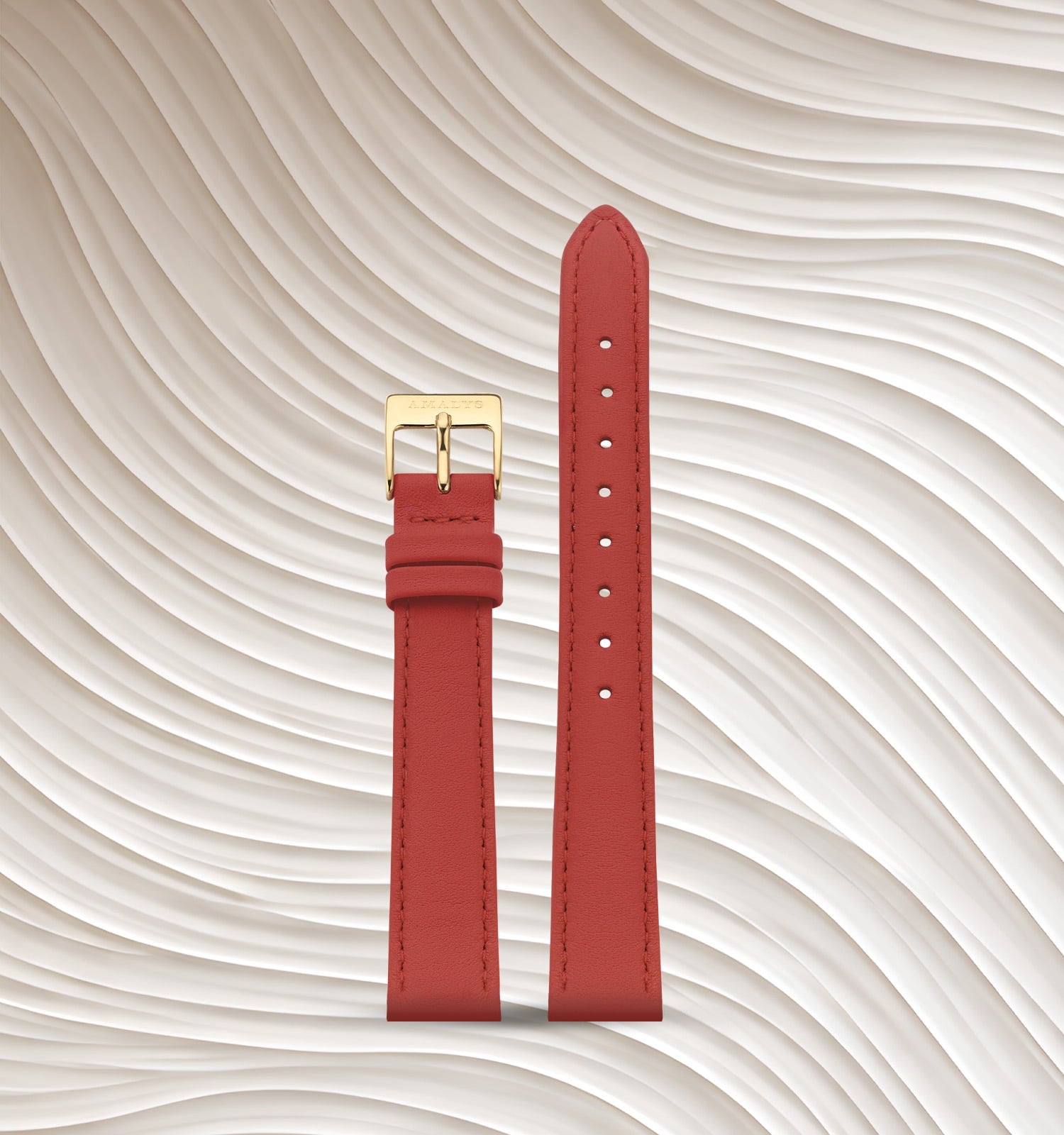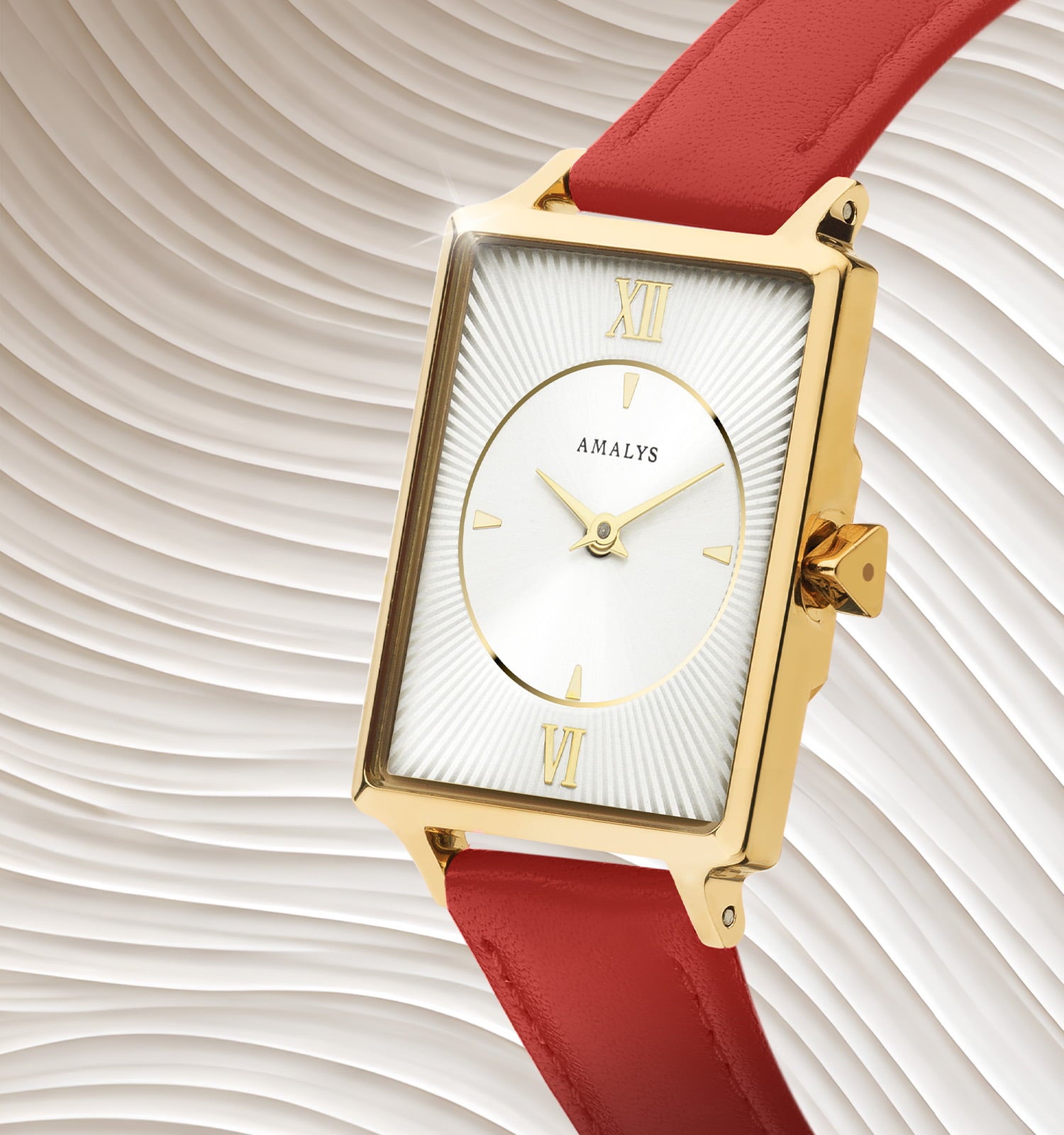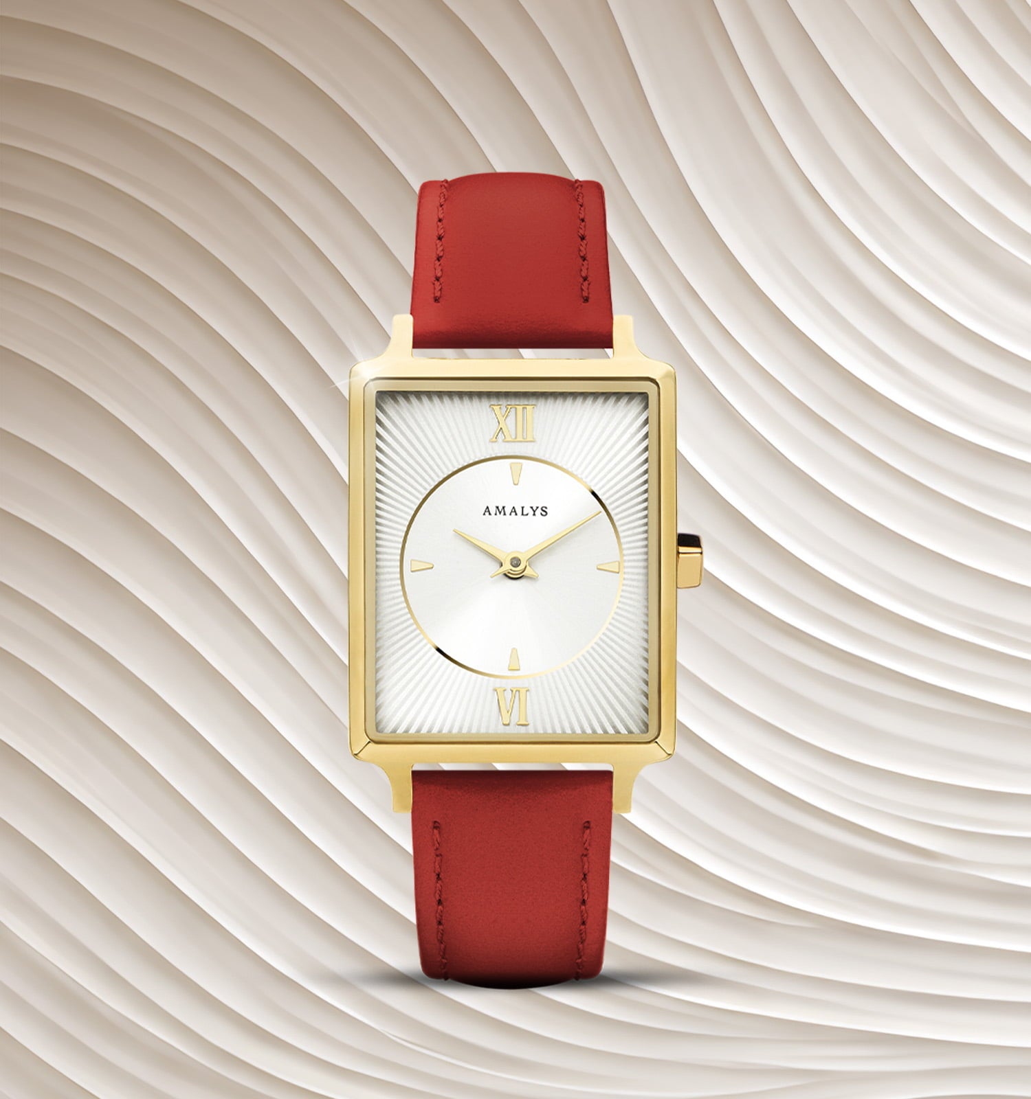 Met zijn heldere wijzerplaat met delicate guillochering en zijn rechthoekige gouden kast heeft Emma een grafische en evenwichtige esthetiek. De rode leren band benadrukt het geheel met durf en elegantie.