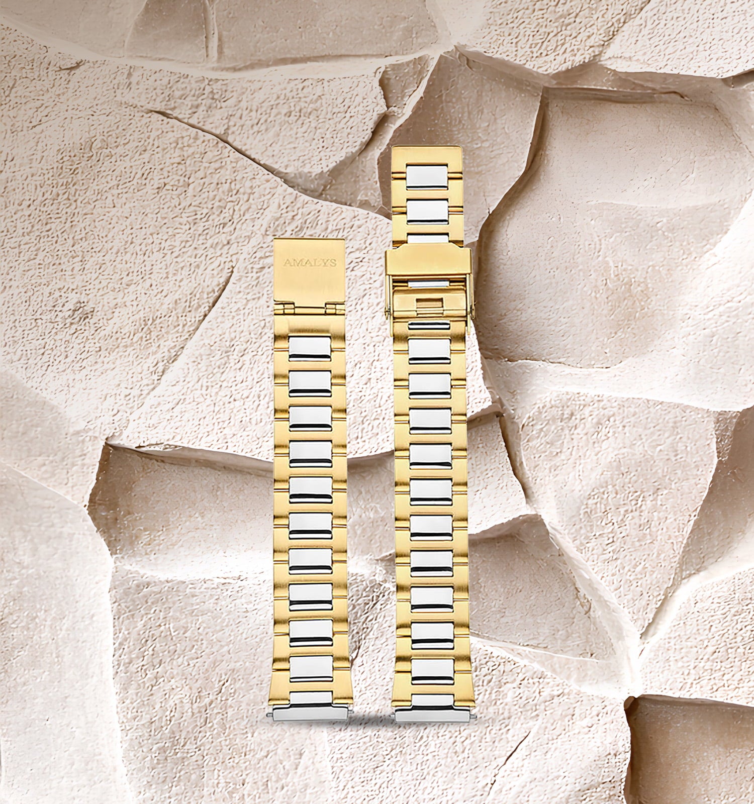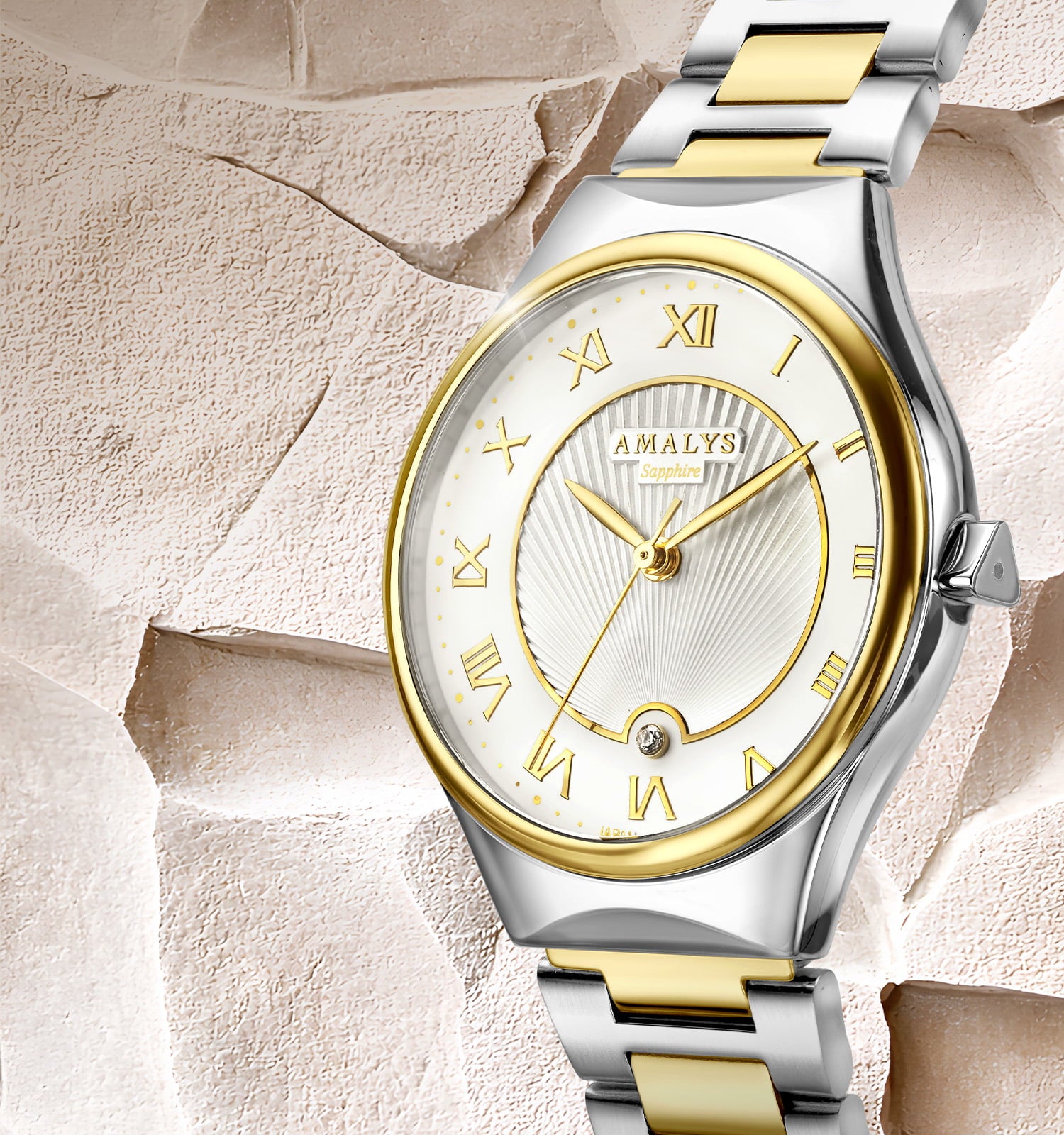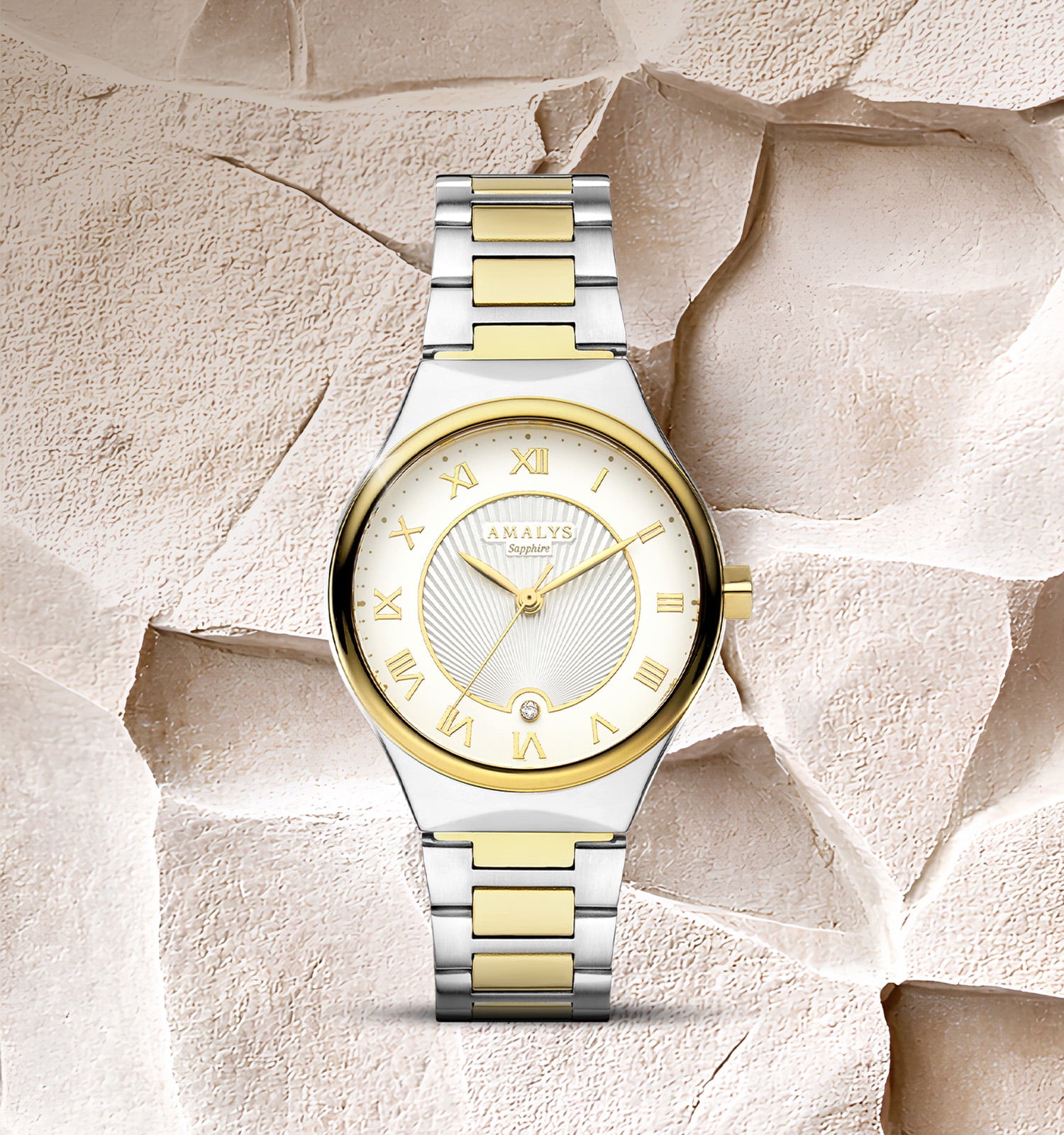 Estelle valt op door het evenwichtige ontwerp van haar tweekleurige wijzerplaat, waar de zachte lichte tinten samenkomen met de diepte van een fijn bewerkt centraal motief. De gouden Romeinse cijfers geven het geheel karakter, terwijl de gestructureerde details voor reliëf en elegantie zorgen.