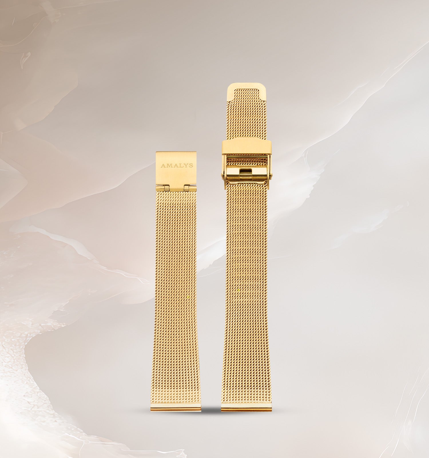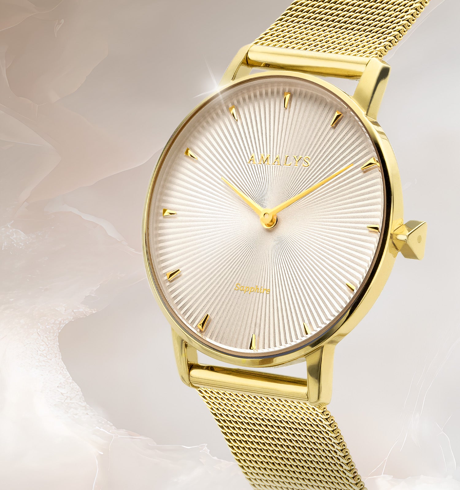 Het horloge Amalys Odile is een echte bestseller en heeft een heldere wijzerplaat met subtiele zilveren reflecties, een delicate zonnestraalpatroon en fijne gouden indexen. Het wordt geleverd in een doosje met een bijpassende sieradenarmband en combineert de kast en het Milanese gaas in verguld staal met een stralende elegantie, voor een strak en resoluut tijdloos silhouet.