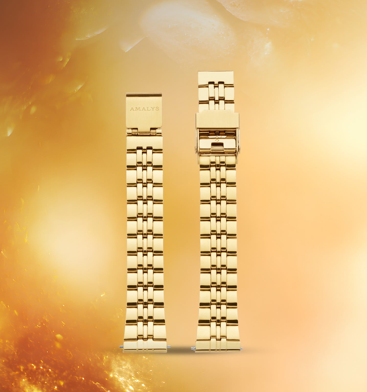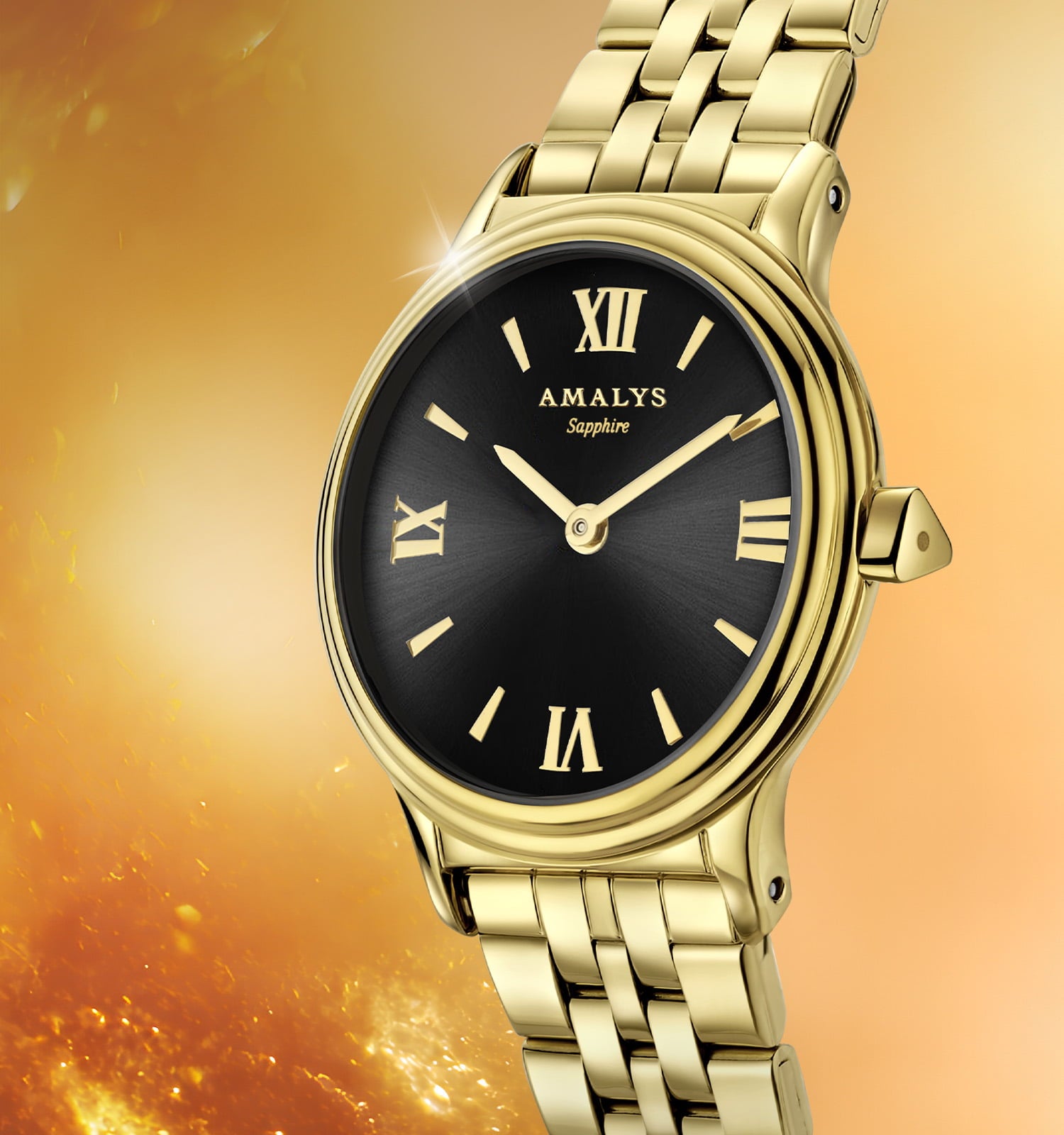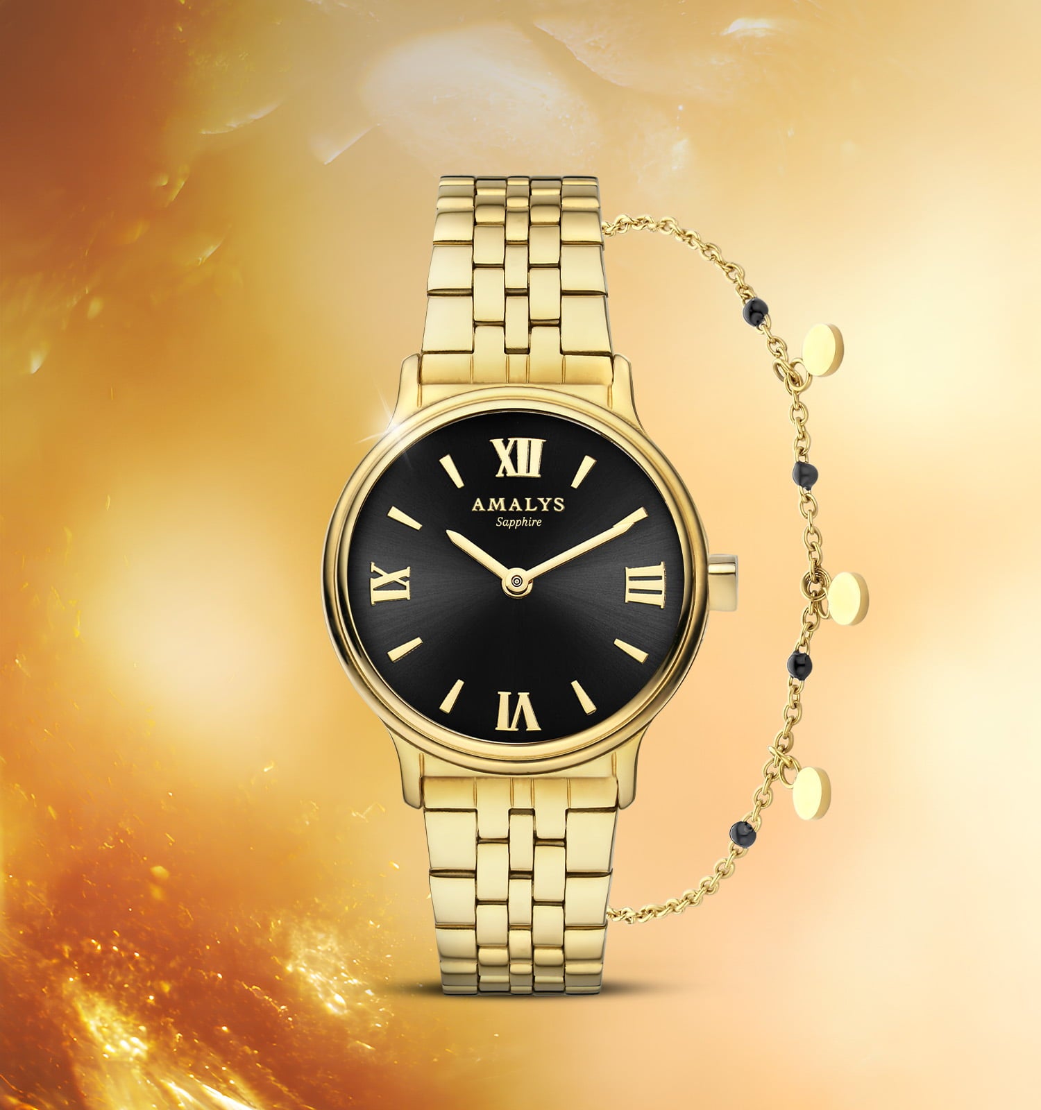 Het Alix-horloge heeft een prachtige zwarte wijzerplaat met zonnestraalpatroon, geaccentueerd door indexen die een vleugje elegantie toevoegen. Het horloge wordt geleverd in een doosje met een sieradenbandje. De gouden kast en de stalen schakelband zorgen voor een elegante touch die u elke dag kunt dragen.