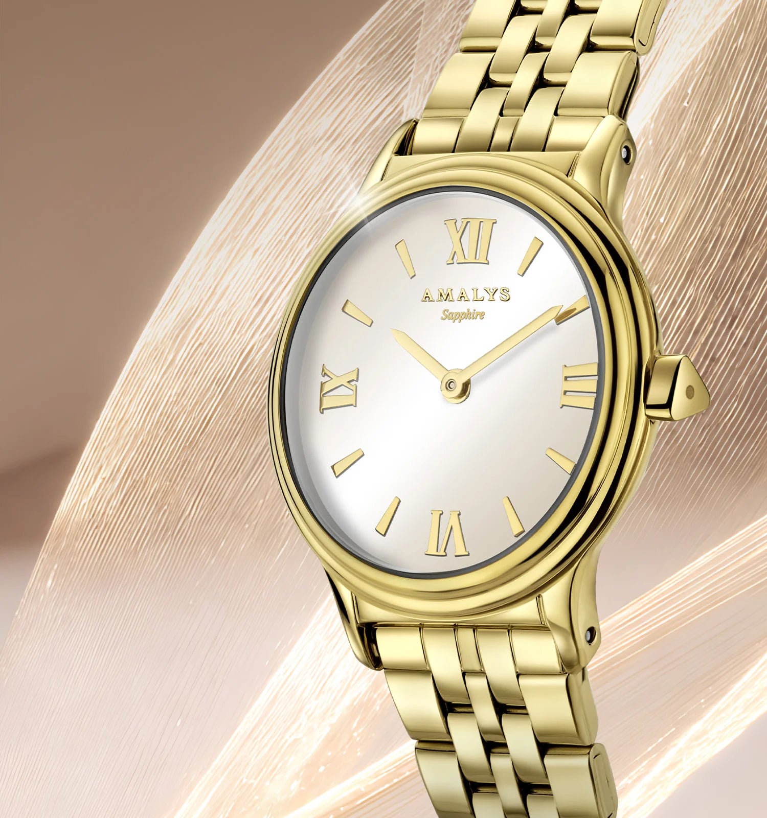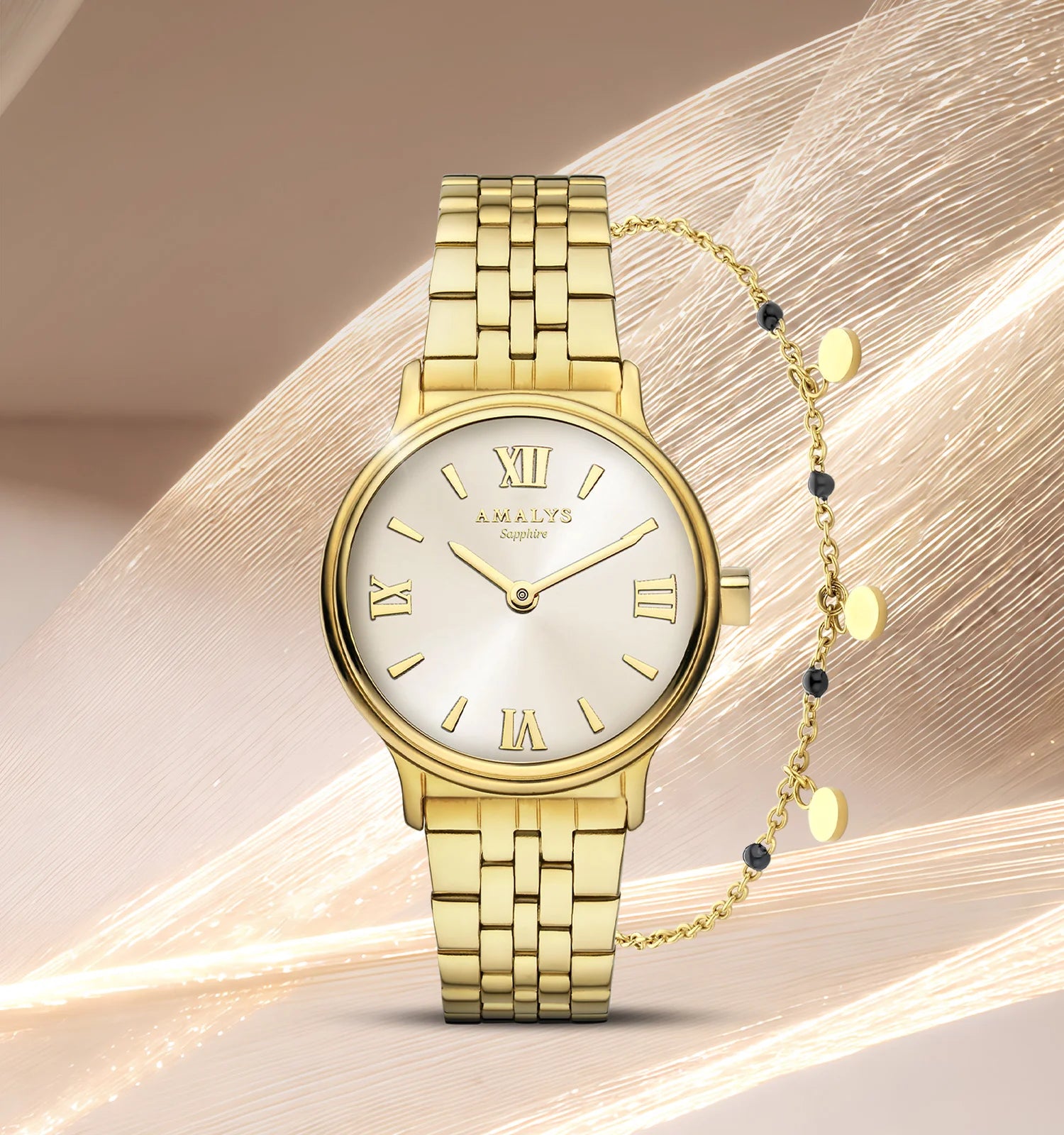 Het Rosie-horloge heeft een prachtige, subtiel vergulde wijzerplaat met zonnestraalpatroon, geaccentueerd door indexen die een vleugje elegantie toevoegen. Het horloge wordt geleverd in een doosje met een sieradenarmband. De vergulde kast en de stalen schakelarmband geven het horloge een elegante uitstraling, waardoor het geschikt is voor dagelijks gebruik.