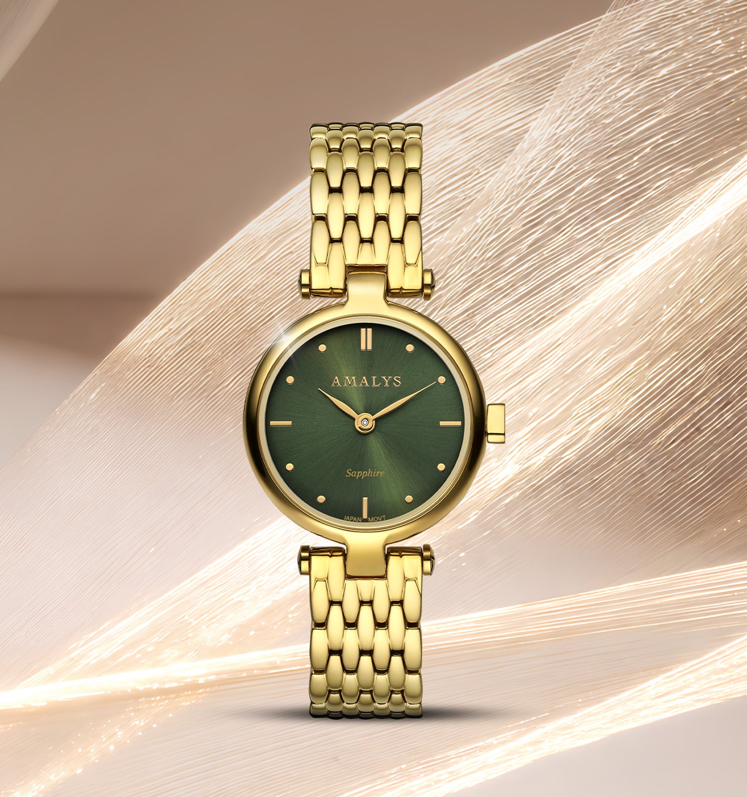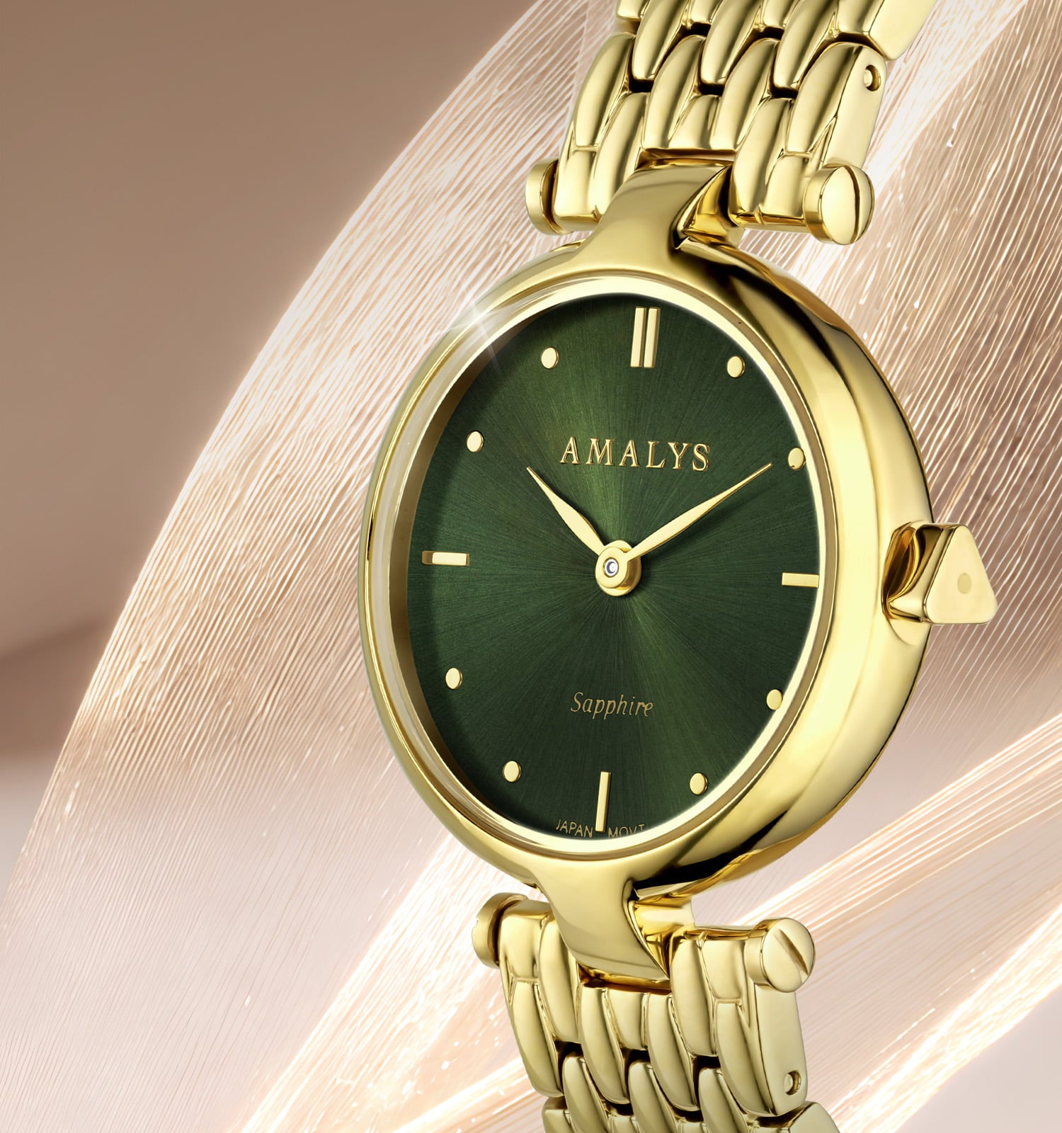 Met haar intens groene wijzerplaat en gouden details straalt Lisette een elegante en unieke uitstraling uit. De reflecties van de gouden stalen armband begeleiden elke beweging en zorgen voor een subtiel en kostbaar lichtspel.