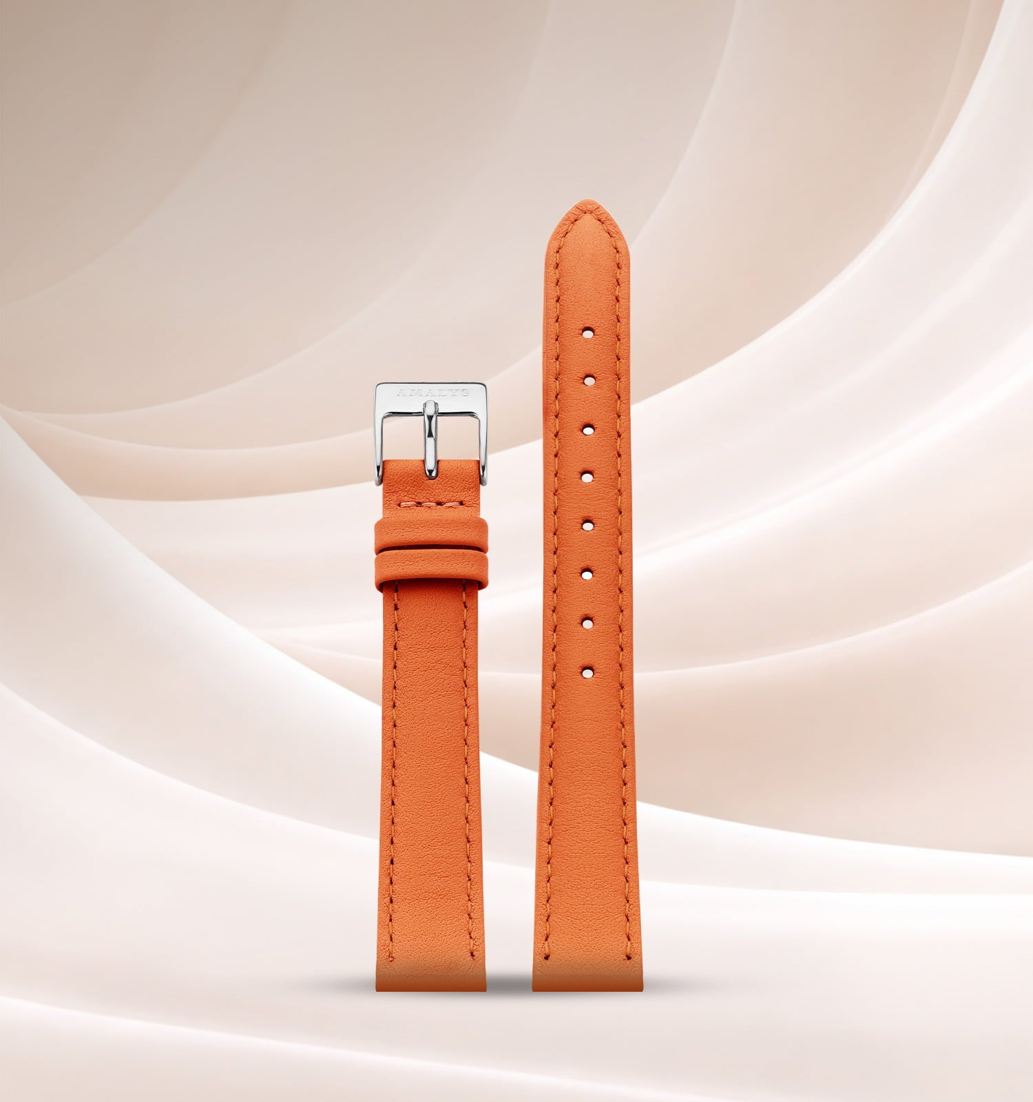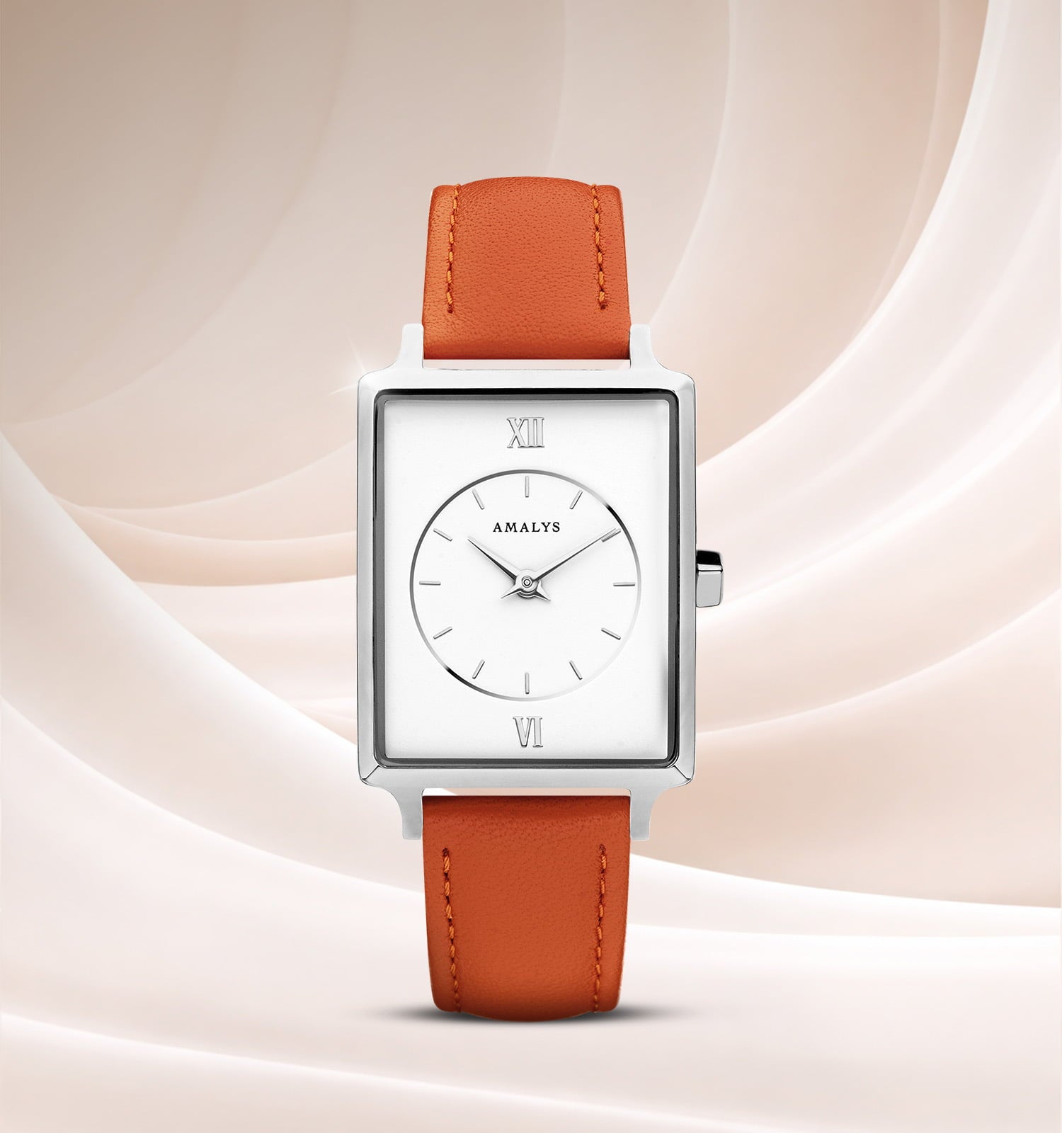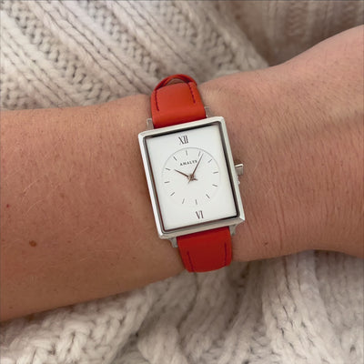Met zijn strakke witte wijzerplaat en rechthoekige kast van Silver staal straalt Lou een eenvoudige en stralende elegantie uit. De oranje leren band zorgt voor een warme en natuurlijke toets, voor een unieke chique look.