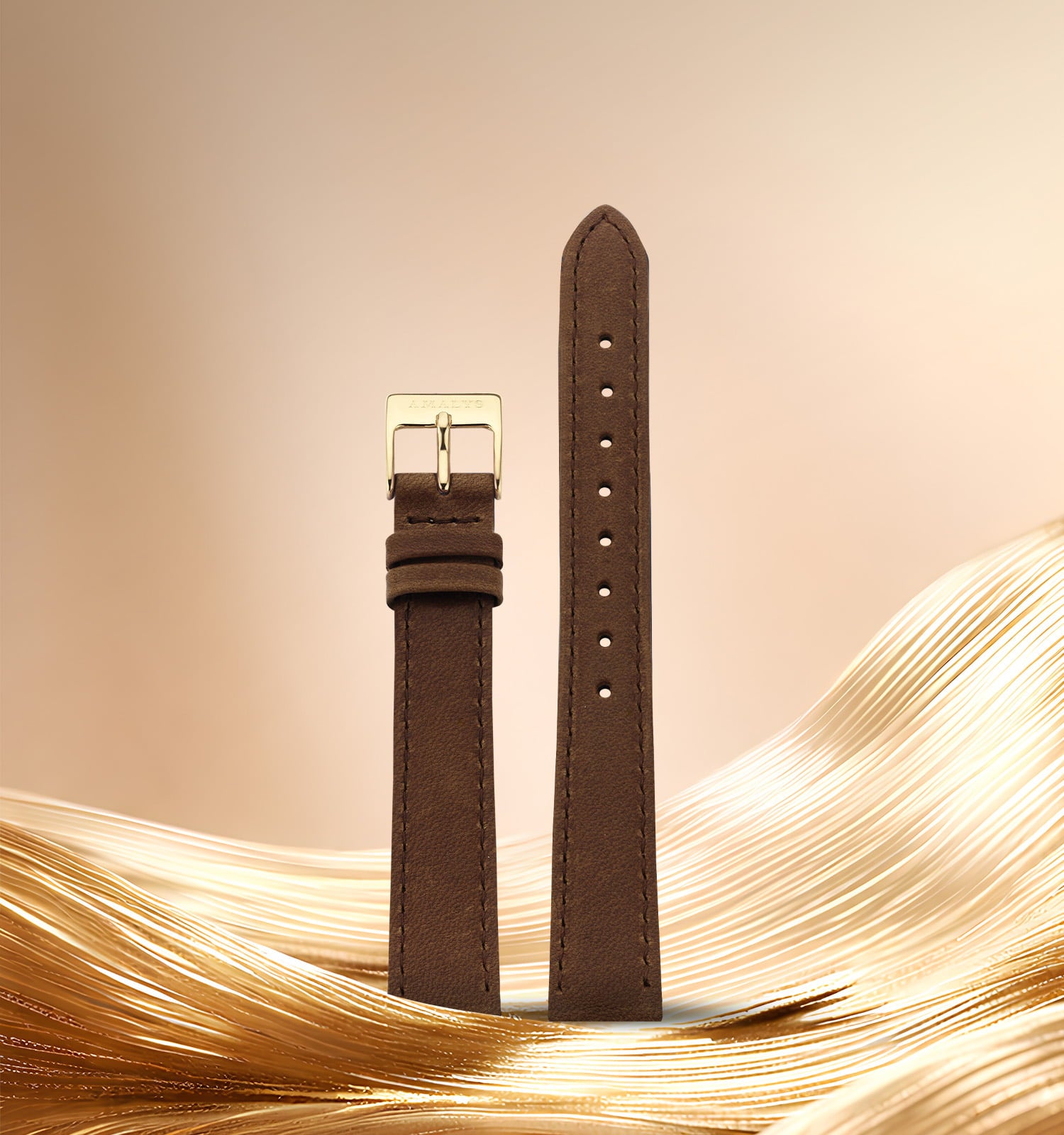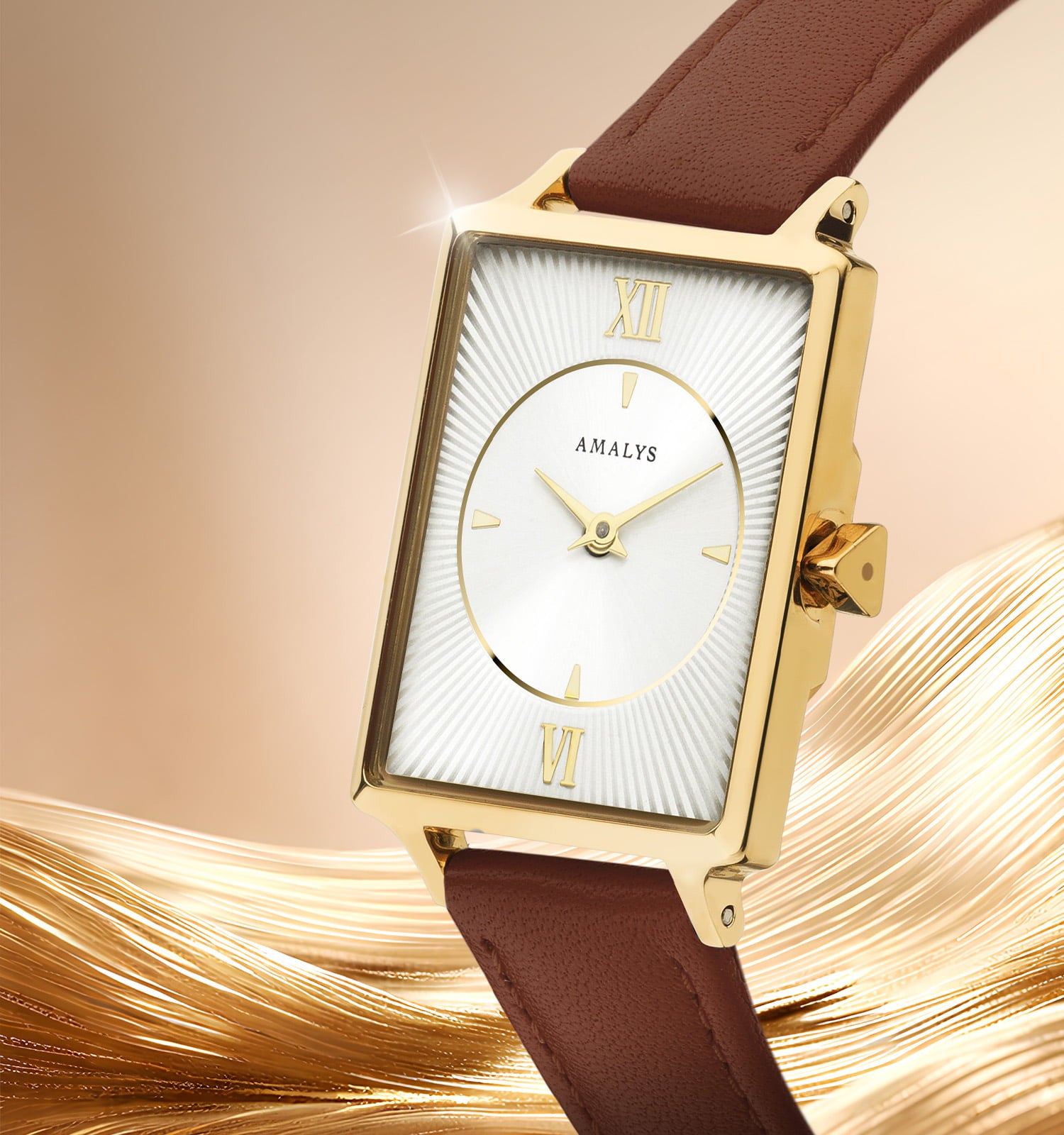 Mathilda onderscheidt zich door een rechthoekige kast met strakke lijnen, die een duidelijk, fijn gegraveerd wijzerplaat accentueert. De gouden indexen en wijzers geven de compositie een nauwkeurige structuur, terwijl de bruine leren band een warme en evenwichtige toets toevoegt.