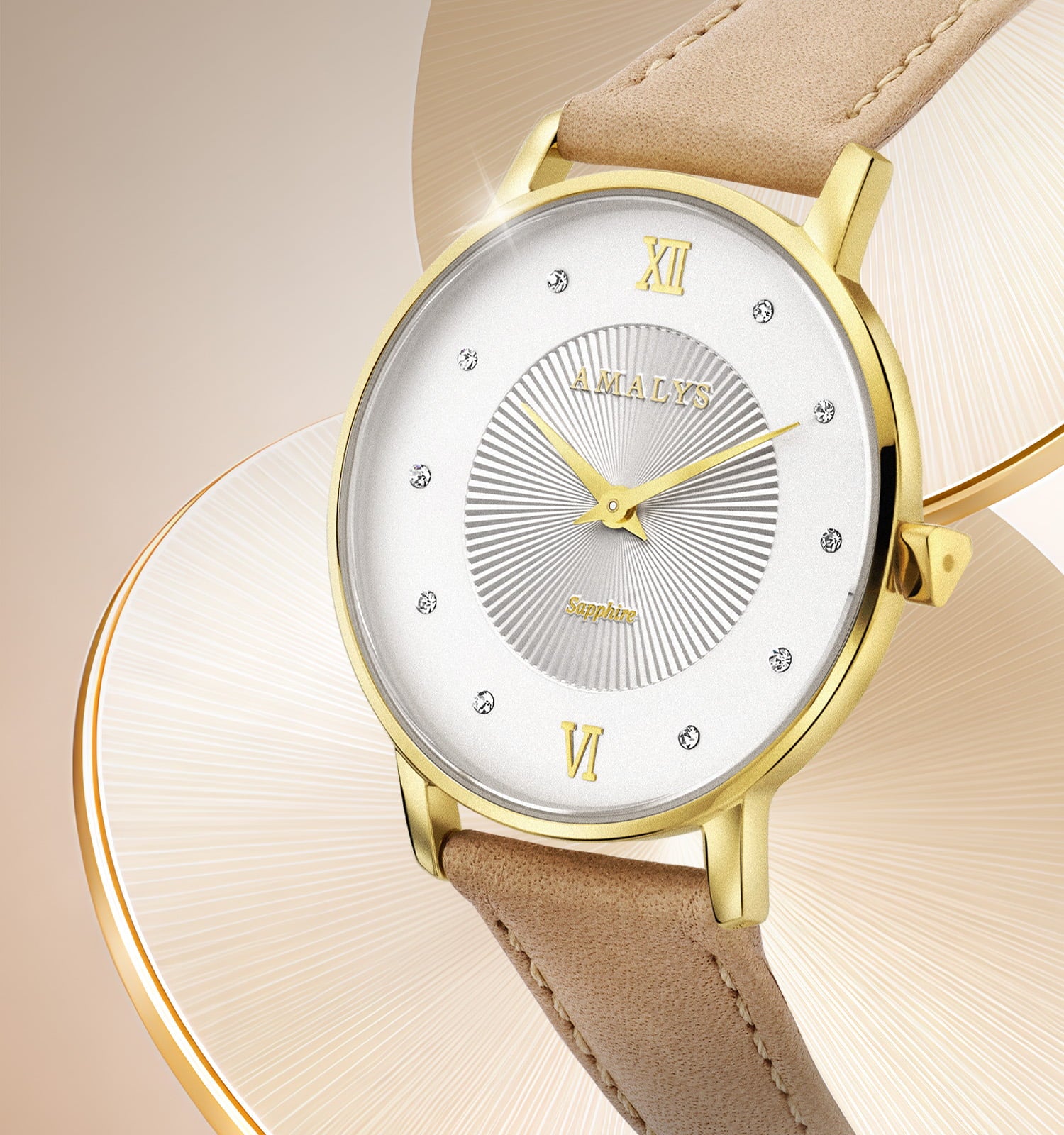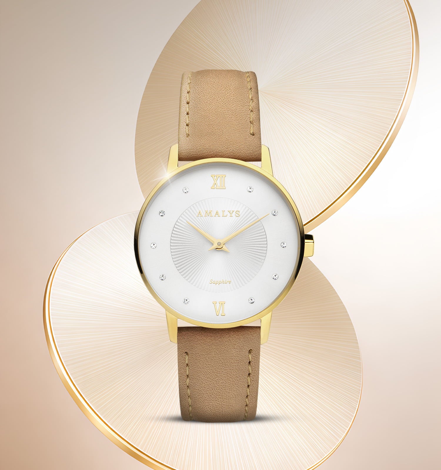 Rosalie combineert een stralend wit wijzerplaat, subtiel gegraveerd en bezet met briljanten, met een gouden kast met zachte lijnen. De nude-kleurige leren band zorgt voor een natuurlijke en warme toets, voor een subtiele elegantie die zowel stralend als tijdloos is.