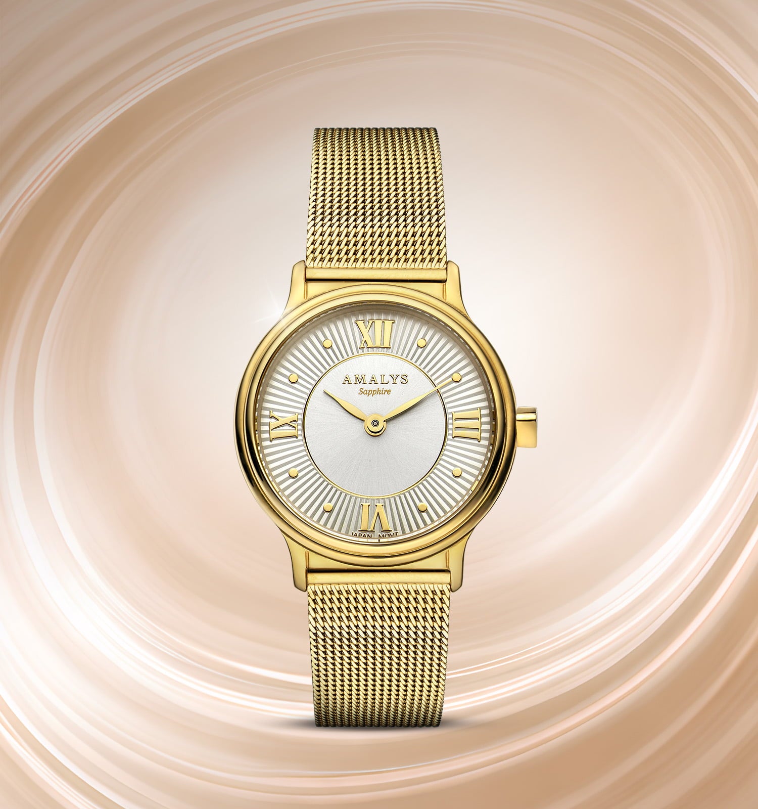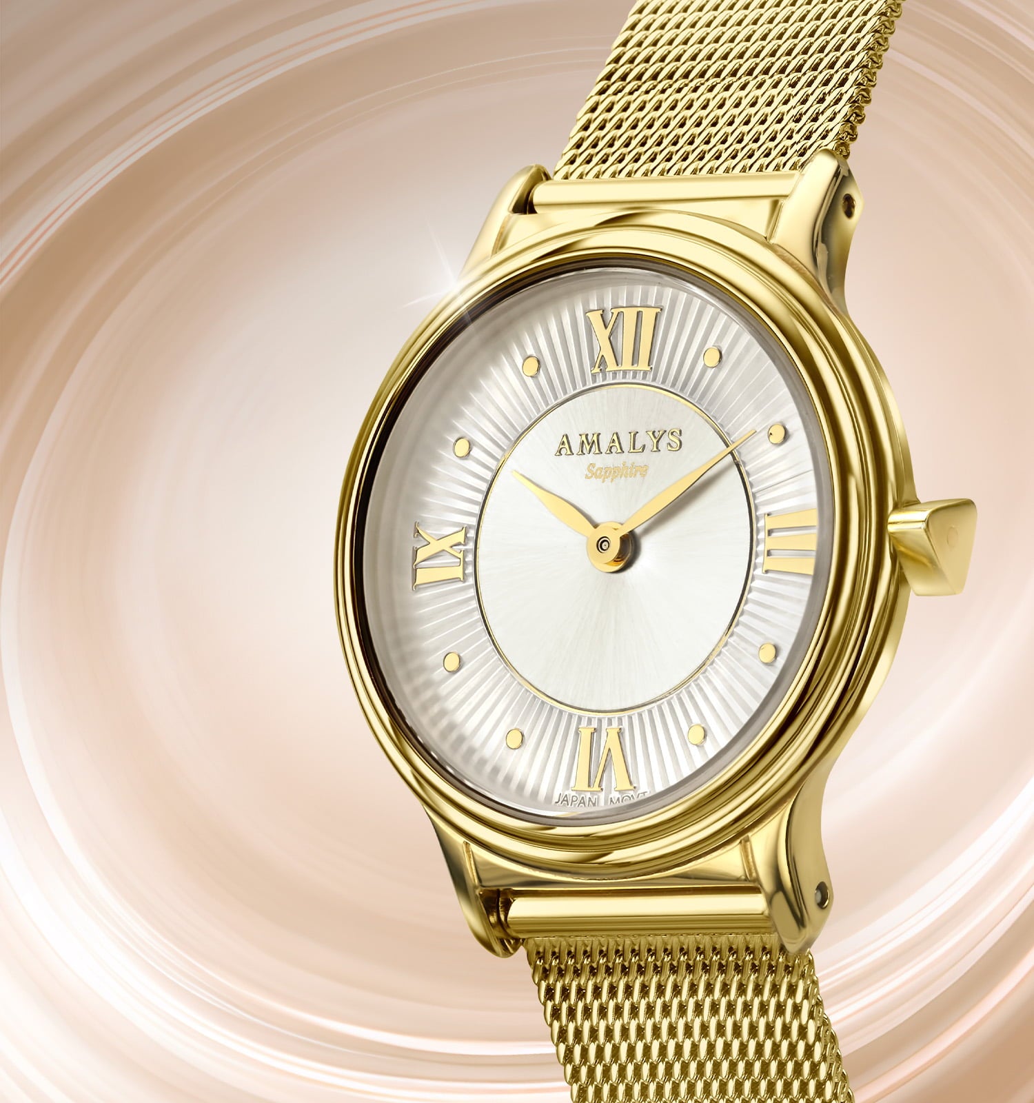 Gouden kast, verlichte wijzerplaat en Milanese mesh-band: Sibylle combineert elegantie en comfort in een tijdloos ontwerp. Een gemakkelijk te dragen horloge, ontworpen om elke outfit te verfraaien, dag na dag.