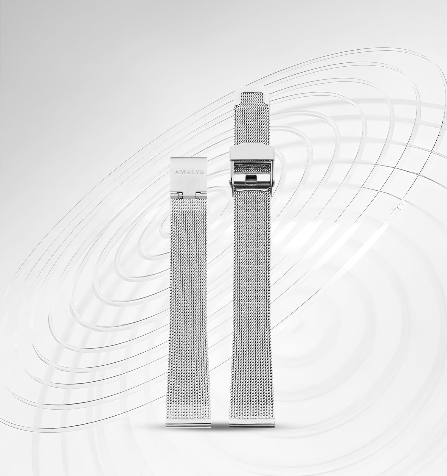 Een nachtblauwe wijzerplaat met een fijn spiraalpatroon, gecombineerd met Silver staal Silver een Milanese schakelband. Een harmonieuze compositie, ontworpen voor een sobere en zelfverzekerde uitstraling.