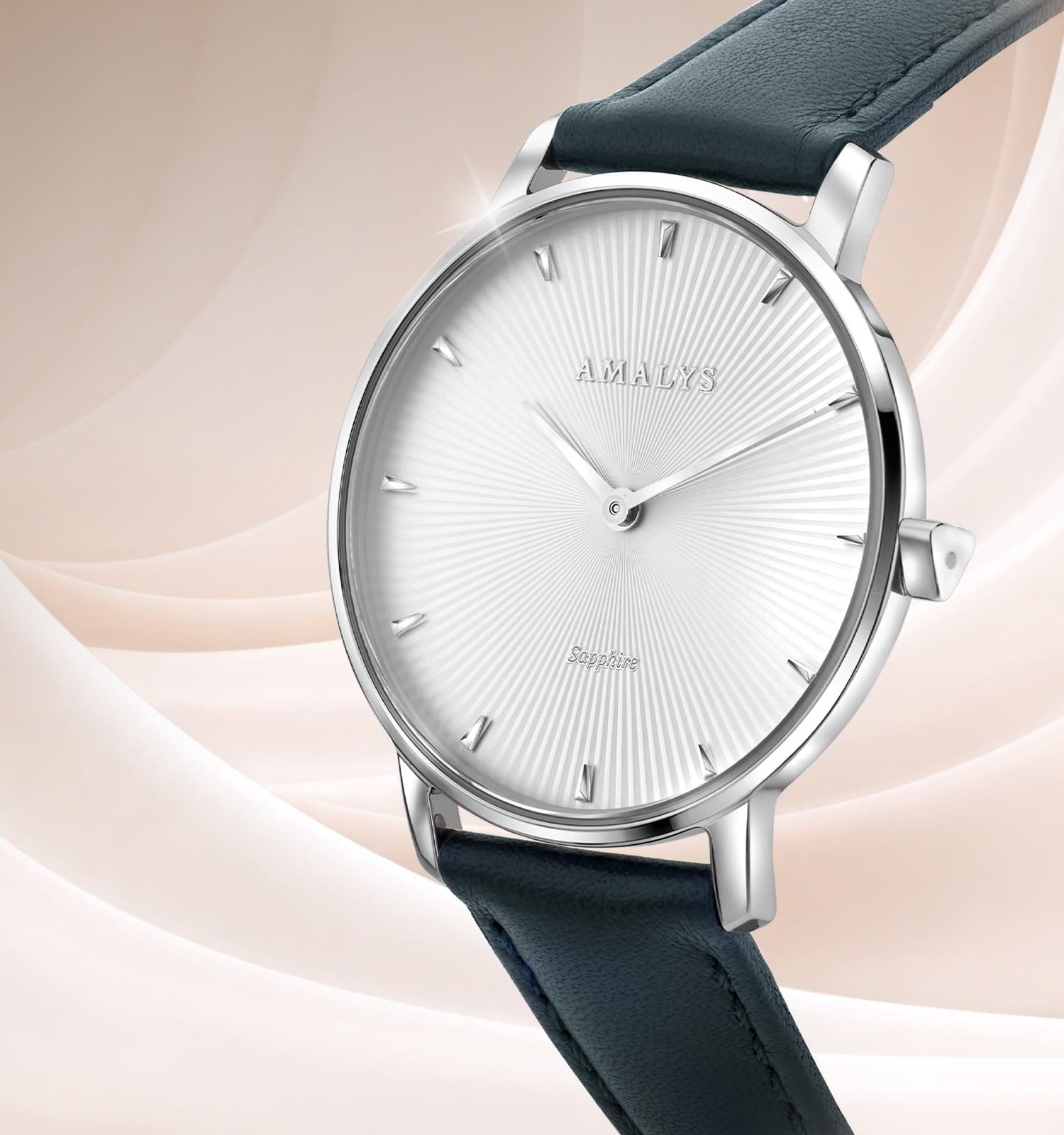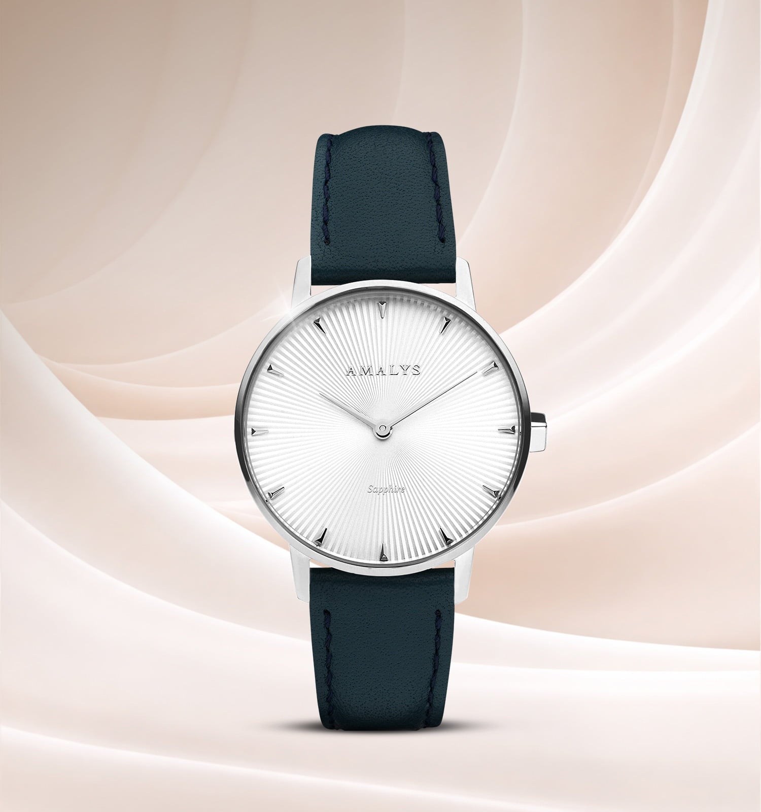Solange betovert met haar bijna minerale helderheid, waarbij het licht vrijelijk speelt op een Silver wijzerplaat Silver fijne reliëfs. In combinatie met een diepblauwe leren band en een gepolijste stalen kast belichaamt zij een discrete, natuurlijke en uiterst moderne elegantie.