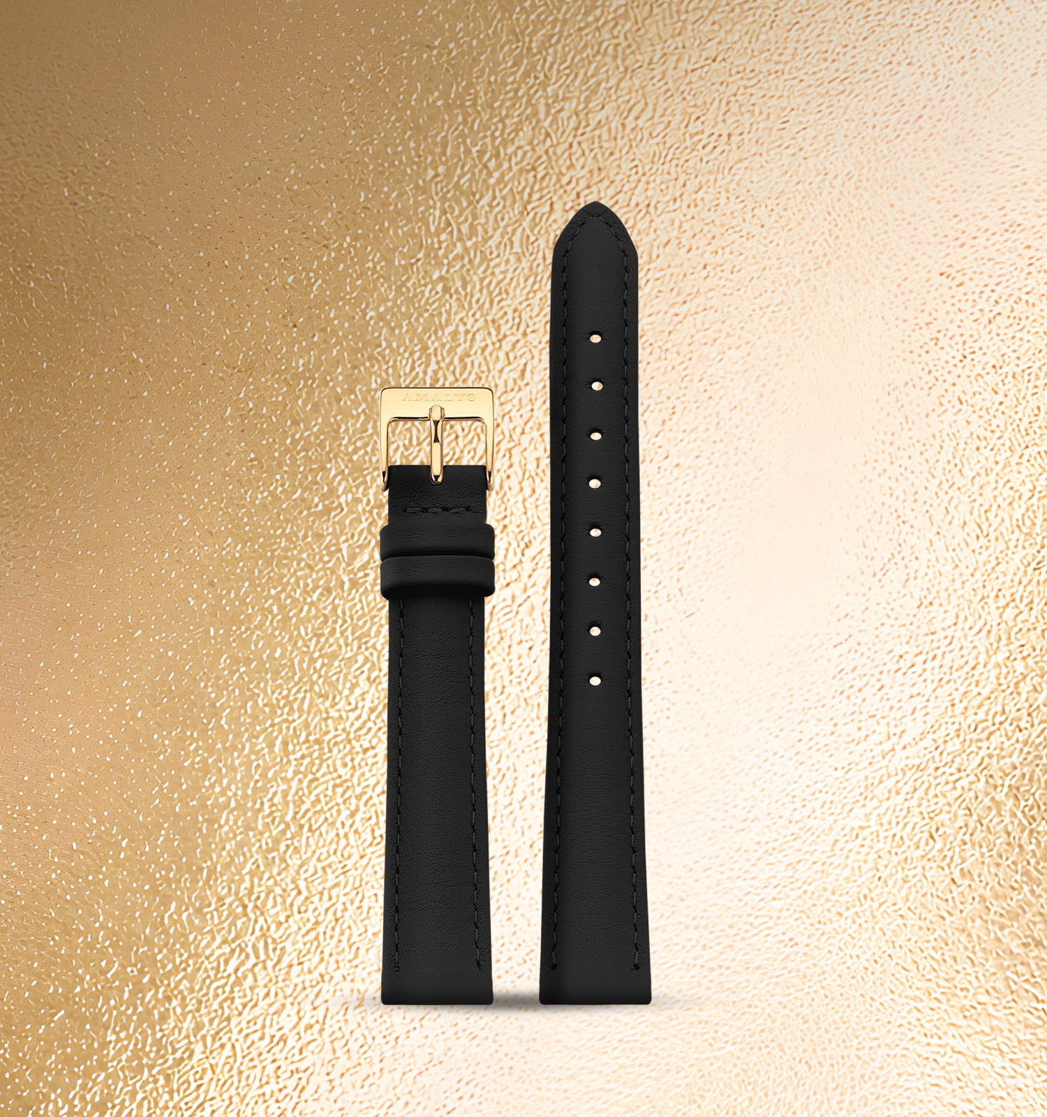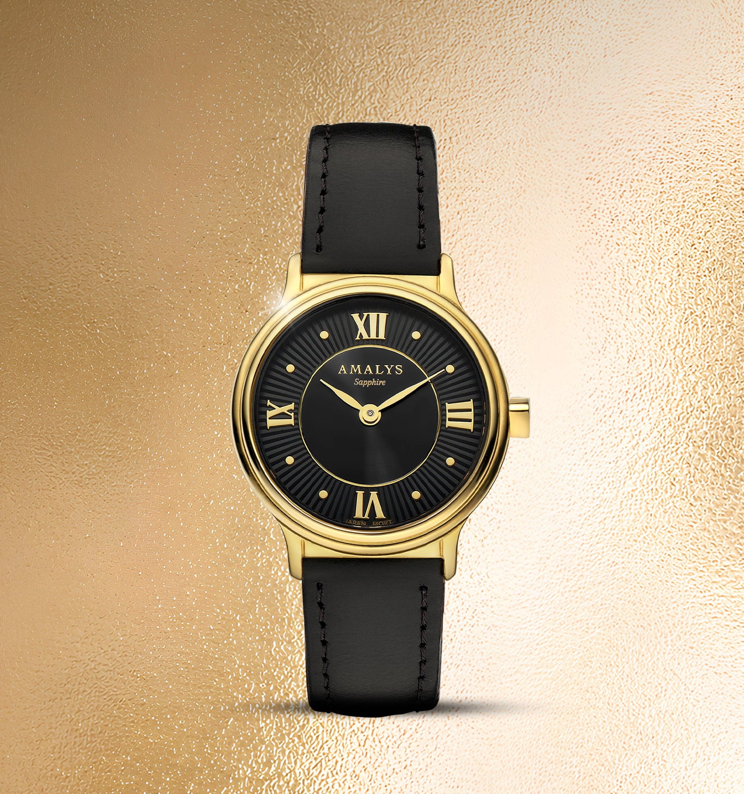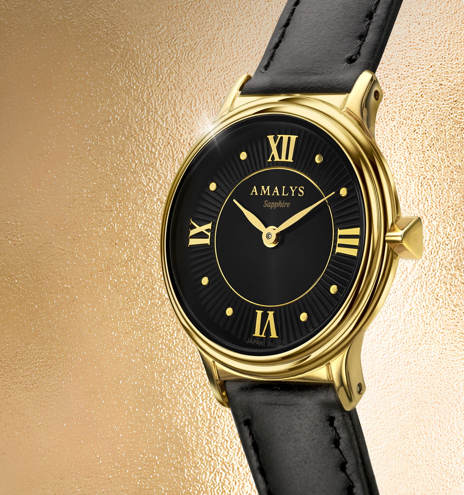 Een zwarte wijzerplaat met subtiele glans, zorgvuldig uitgebalanceerde gouden details en een zwarte leren band. Een beheerste esthetiek, ontworpen voor een elegante en duurzame uitstraling.