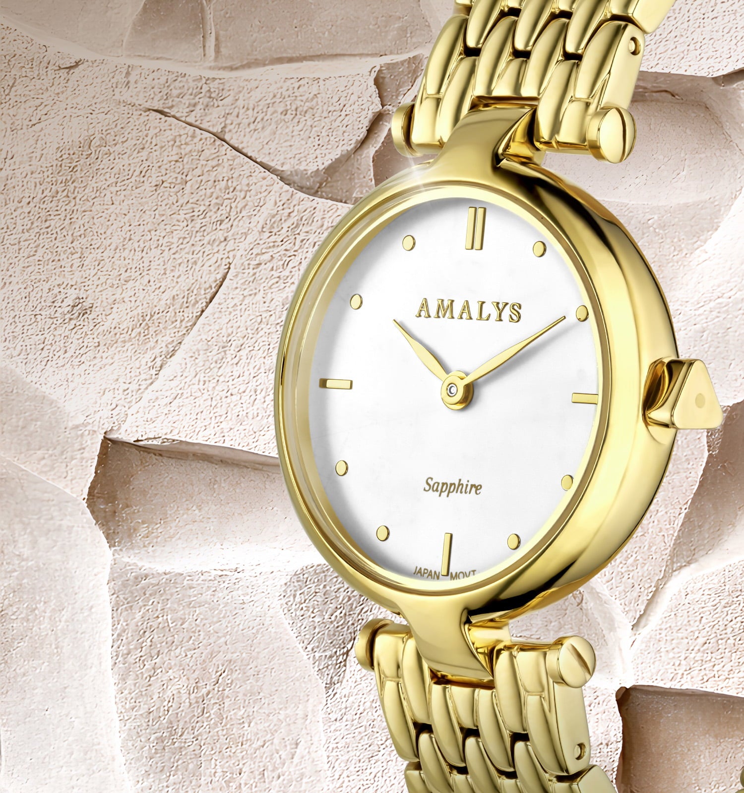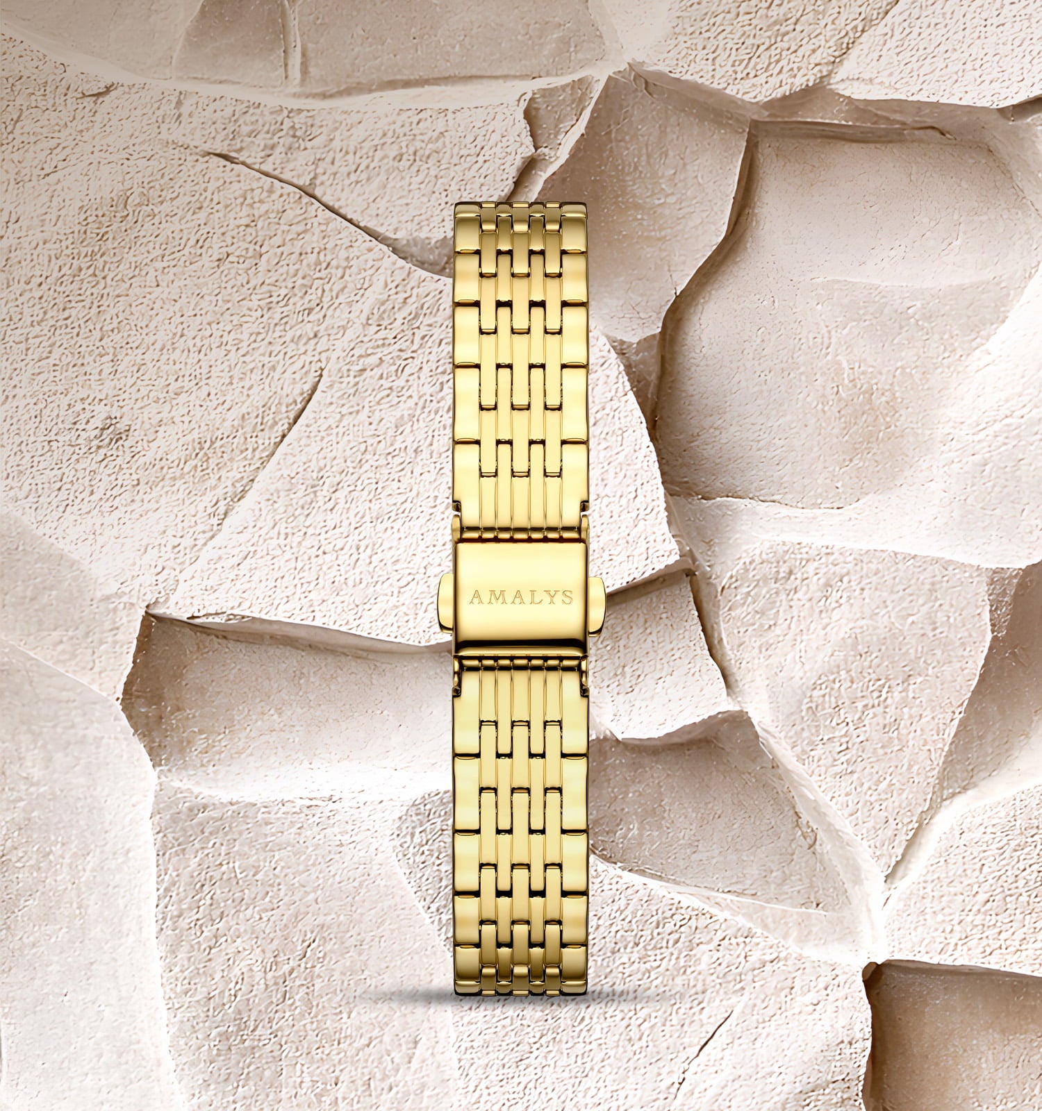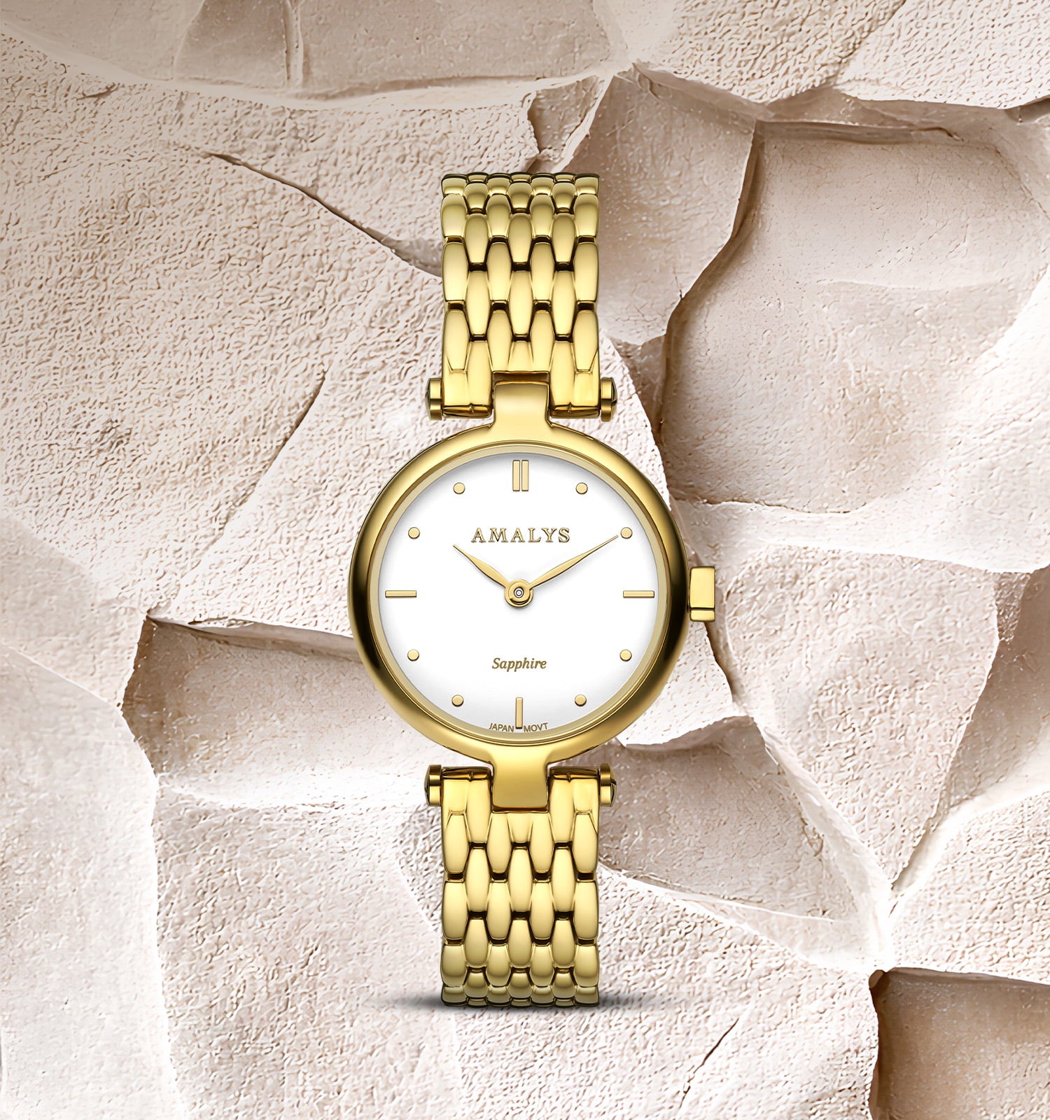 Met zijn strakke witte wijzerplaat en ronde gouden kast straalt Sunny een zachte, stralende elegantie uit. De indexen en fijne wijzers geven het geheel een subtiele structuur, terwijl de gepolijste schakelband voor een evenwichtige uitstraling om de pols zorgt.