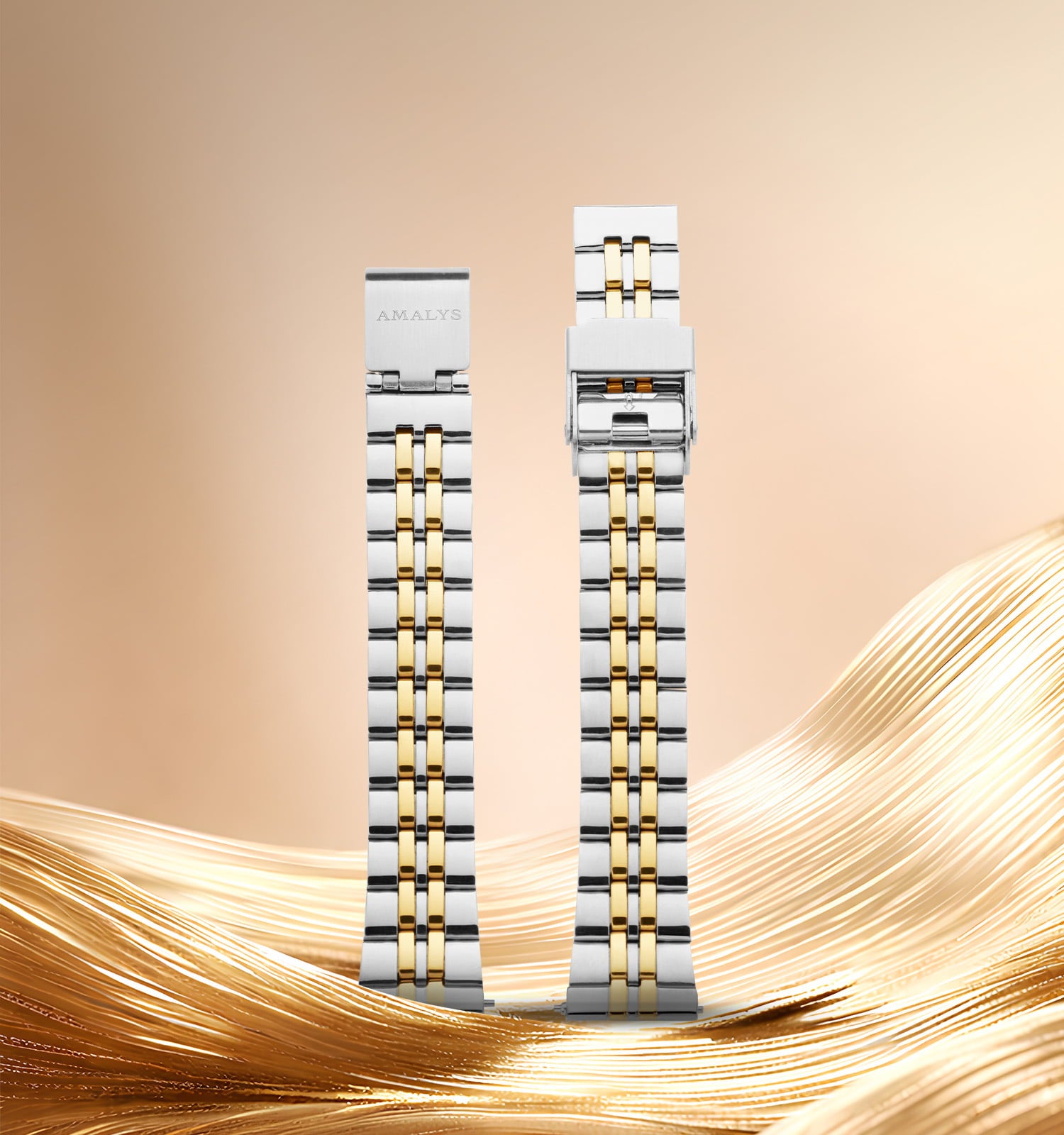 Goudkleurige kast, lichtgevende wijzerplaat en tweekleurige stalen armband met verzorgde afwerking: Suzy combineert elegantie en moderniteit in een tijdloos ontwerp, ontworpen om elke outfit te verfraaien.
