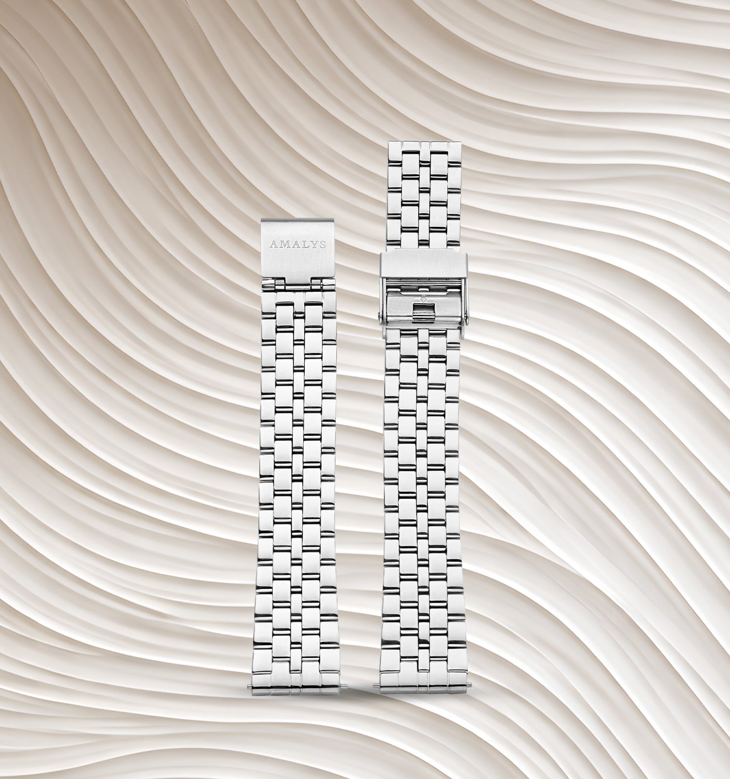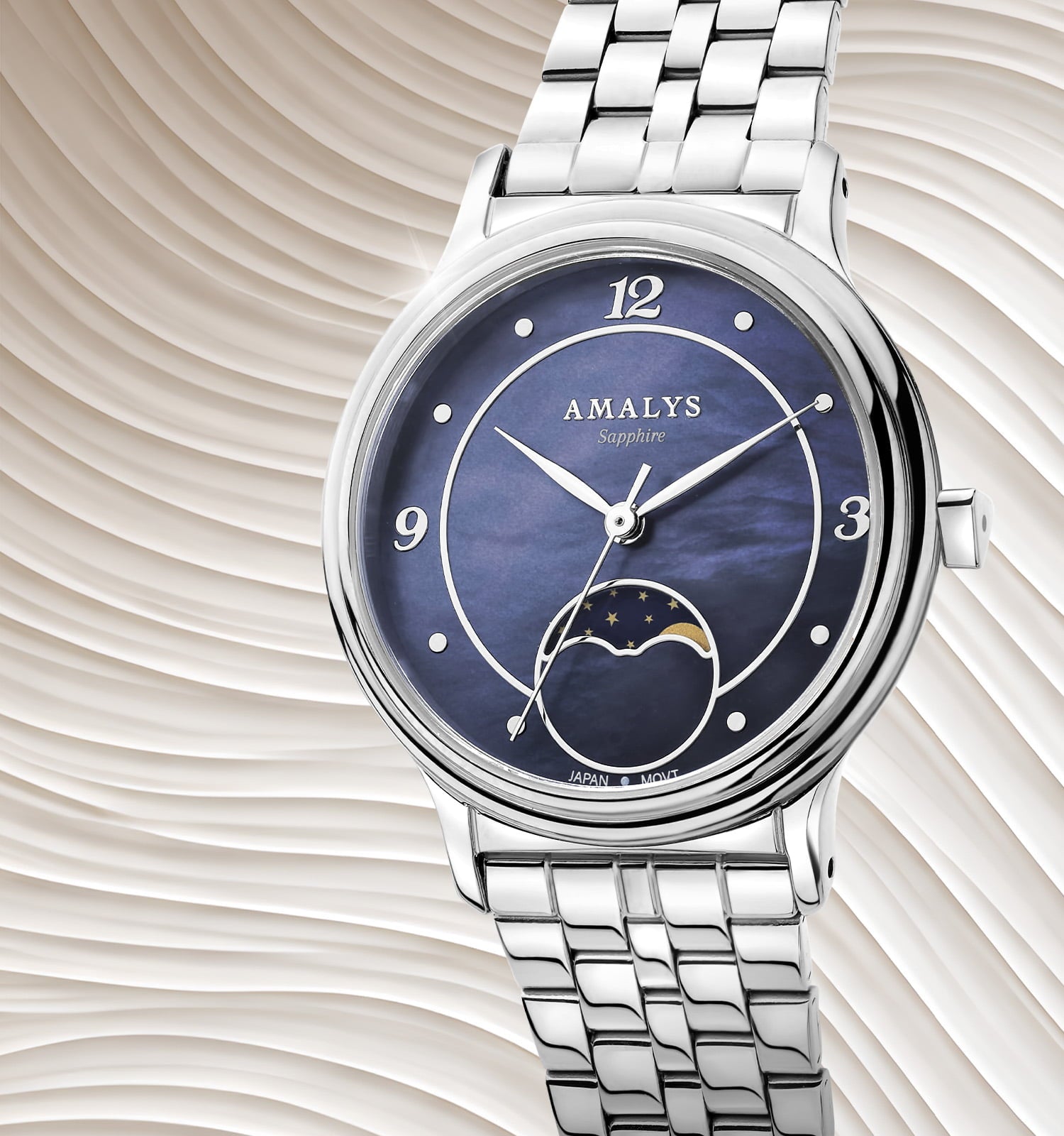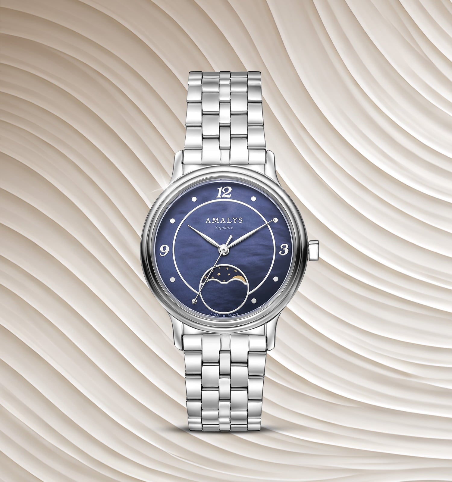 Avec son cadran bleu profond aux reflets nacrés, animé par une élégante complication dite "phase de lune", et son boîtier en acier argenté aux lignes fluides, cette montre incarne une poésie subtile et résolument contemporaine.