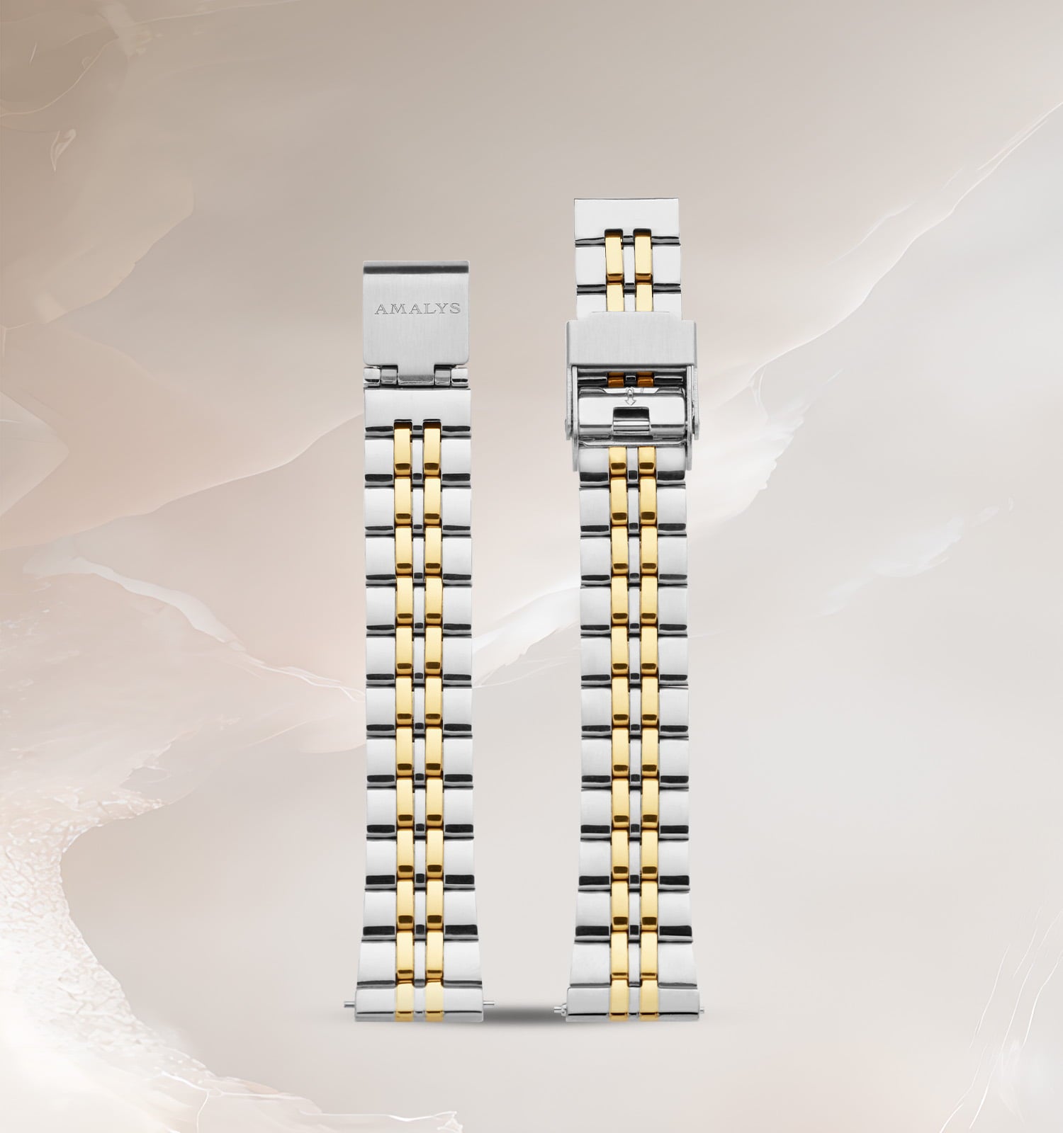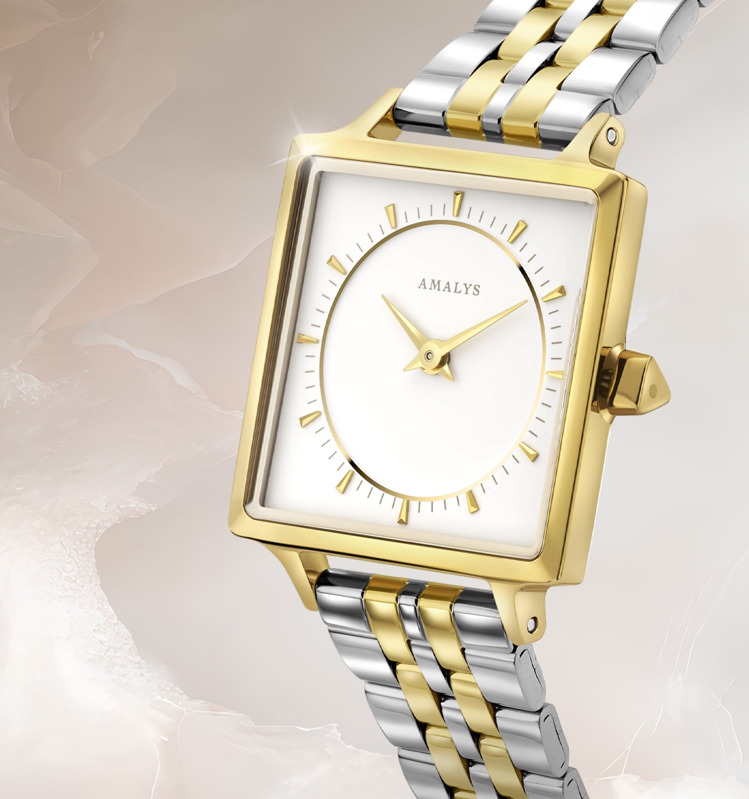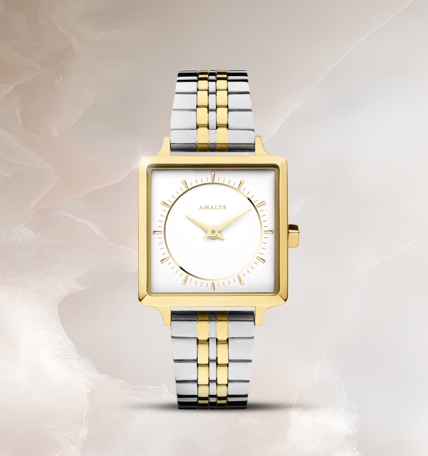 Melody compose une harmonie délicate entre son cadran blanc neige et son boîtier carré doré. Le bracelet en acier bicolore vient y apporter une note de modernité subtile, pour une allure lumineuse et raffinée.